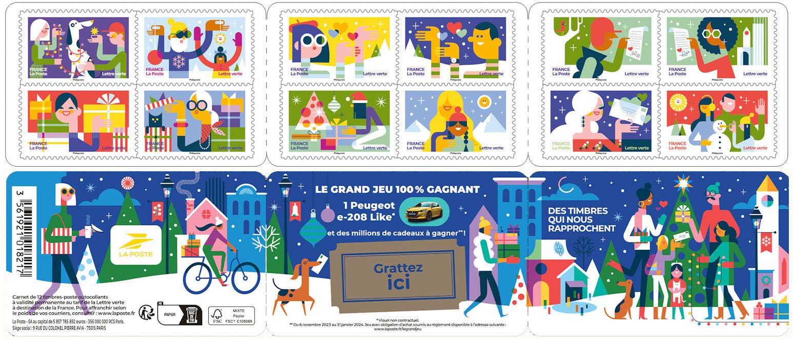 | Commentaire | Visuel de la couverture : dans un paysage hivernal, des personnages et des animaux échangent des nouvelles dans la cité, en cette fin d'année 2023. Volet droit - le titre : "Des Timbres qui nous rapprochent", avec une famille et leur compagnon à 4 pattes échangeant des voeux de fin d'année au coeur de la cité volet central : un personnage porte des paquets cadeaux et son chien porte le courrier des voeux de fin d'année + "Grattez ici", pour participer au Grand Jeu de Noël, du 06 novembre 2023 au 31 janvier 2024. - un jeu avec obligation d'achat, soumis au règlement disponible à l'adresse suivante : www.laposte.fr/legrandjeu. volet gauche : une femme et un cycliste transportent des paquets cadeaux pour leurs proches + le logo de La Poste, le code barre et le type de papier utilisé + l'utilisation des timbres |