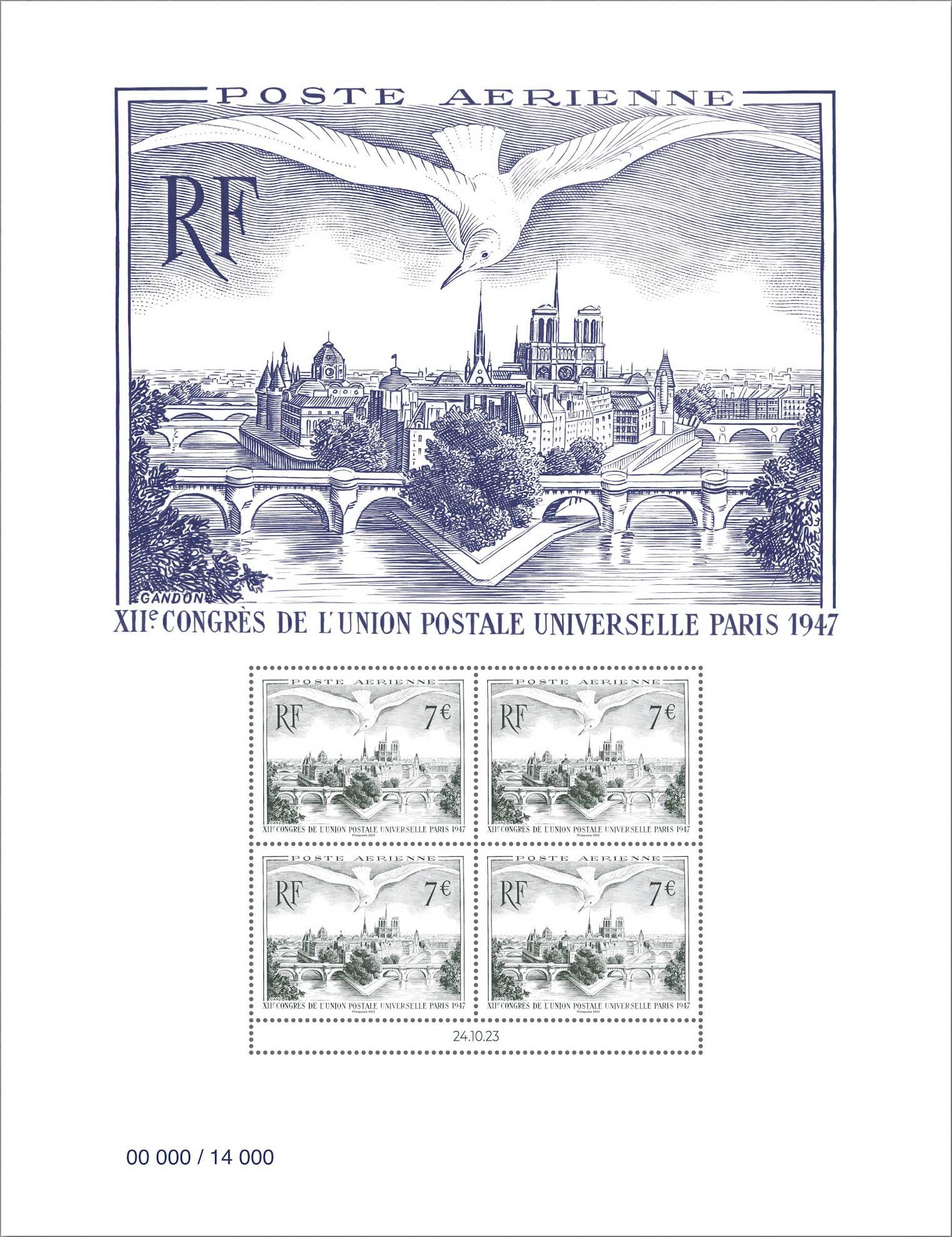 | Description | Lancée en 2021, la série se poursuit avec une cinquième affi che dédiée au timbre Poste aérienne « XIIe congrès de l’Union Postale Universelle Paris 1947 ». Ce timbre, initialement émis le 7 mai 1947, a été illustré et gravé par Pierre Gandon et représente l’île de la Cité à Paris, que survole un oiseau aux ailes déployées. |