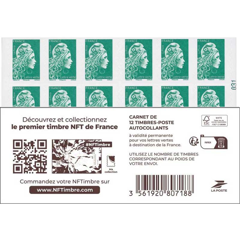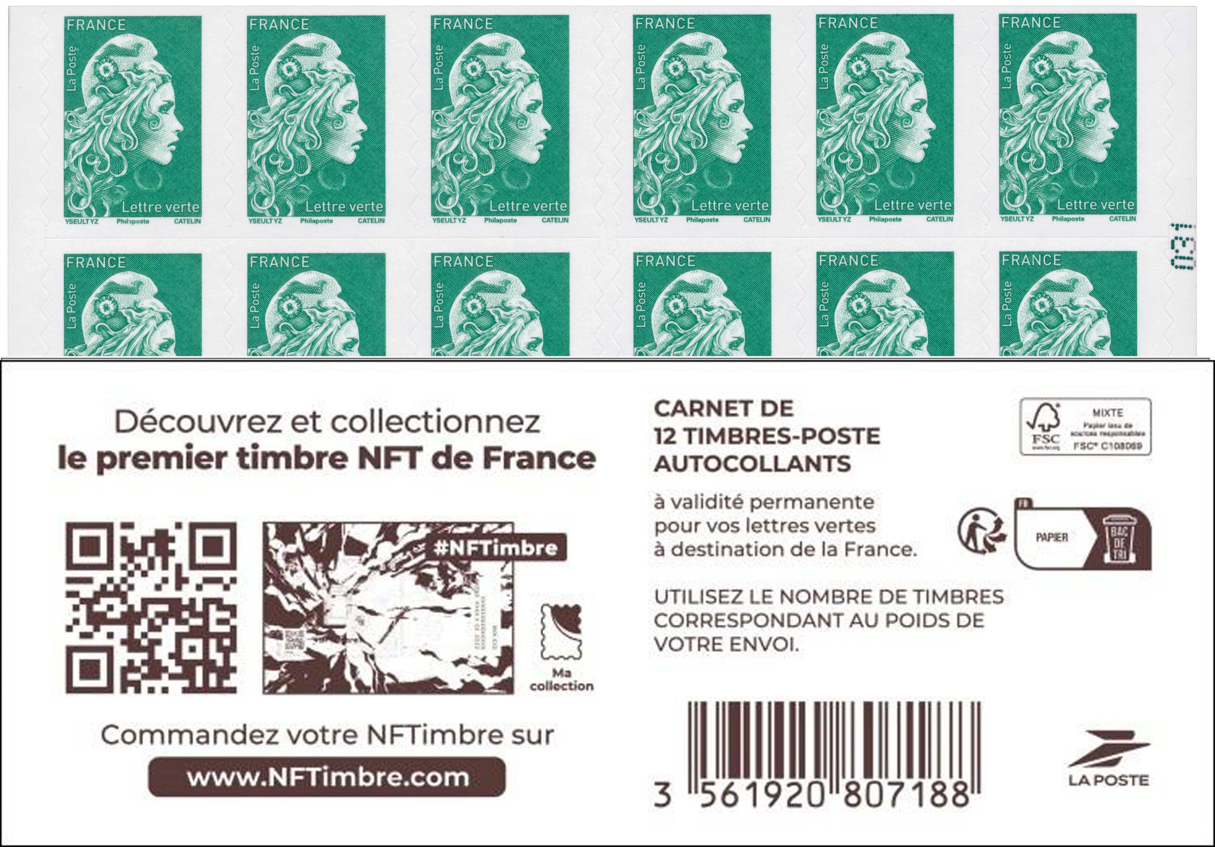 | Description | Carnet Marianne lettre verte "PREMIER TIMBRE NFT DE FRANCE" |