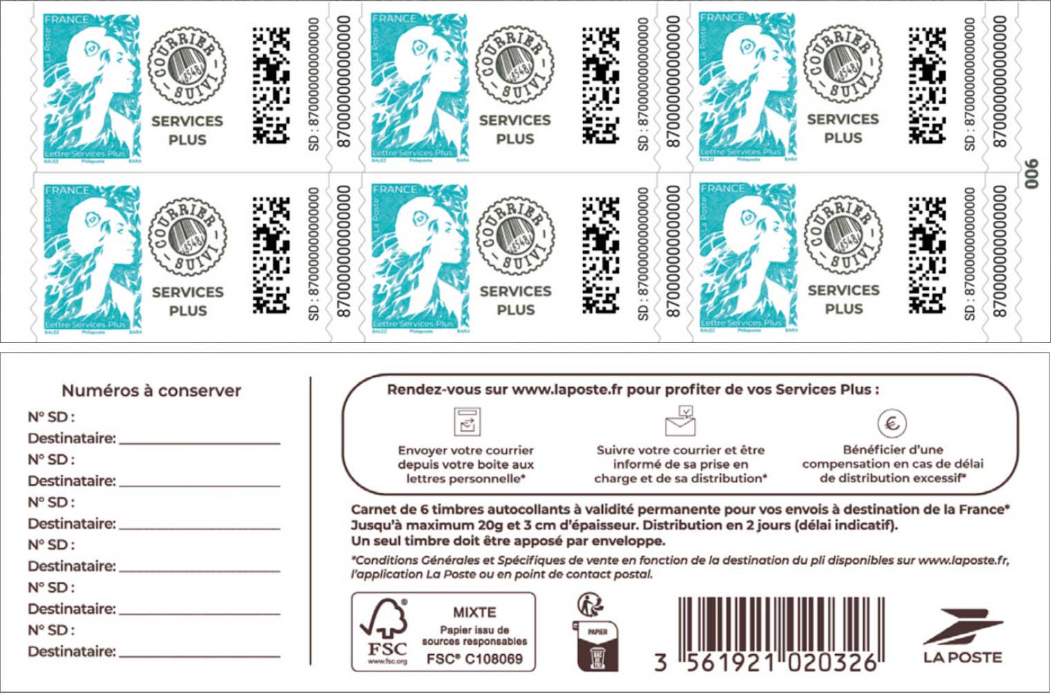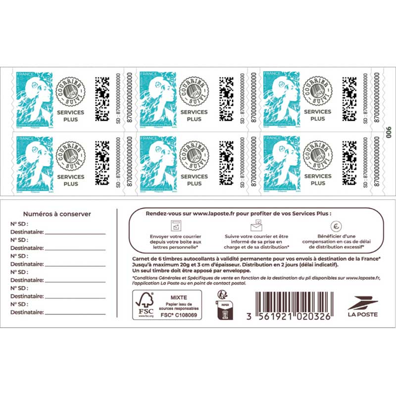 | Description | Carnet de 6 timbres pour lettre verte courrier suivi Service Plus autoadhésive |