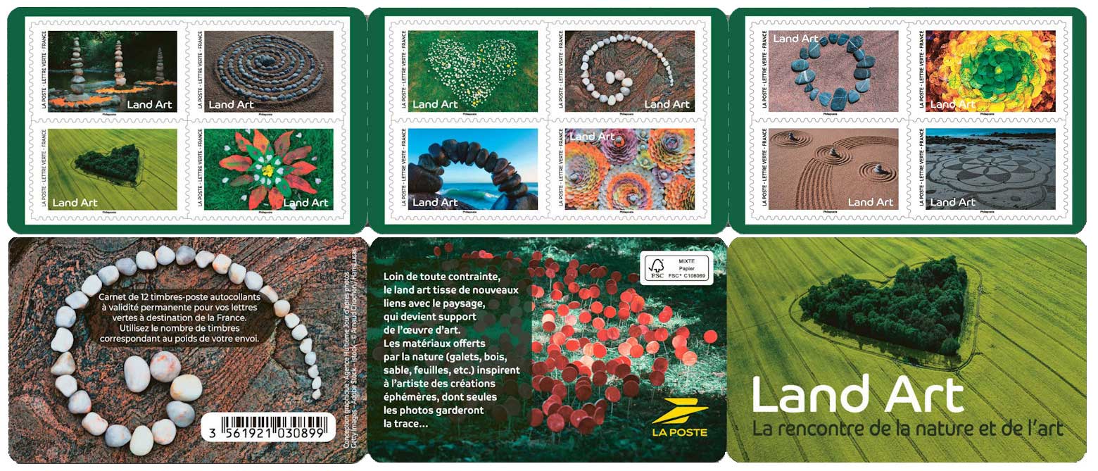 | Commentaire | Visuel de la couverture : Titre : Land Art; la rencontre de la nature et de l'art sur un bosquet vert, en forme de coeur / Texte : "Loin de toute contrainte, le land art tisse de nouveaux liens avec le paysage, qui devient support de l’oeuvre d’art. Les matériaux offerts par la nature (galets, bois, sable, feuilles, etc…) inspirent à l'artiste des créations éphémères, dont seules les photos garderont la trace" sur des sucettes rouges fixées à l'extrémité de bâton installés dans l'herbe + le logo La Poste et le type de papier utilisé. / L'utilisation des timbres pour un affranchissement Lettre Verte et le code barre, sur une spirale de galets blancs, posée sur la roche. |