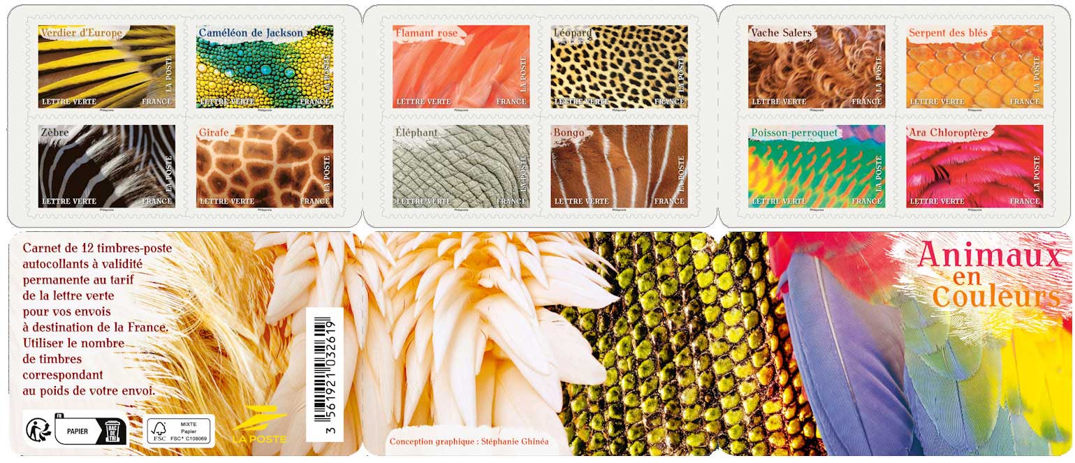 | Description | Émission d'un carnet de 12 timbres-poste, illustré par des photos en gros plan de plumes, de pelages ou d’écailles d’animaux. |