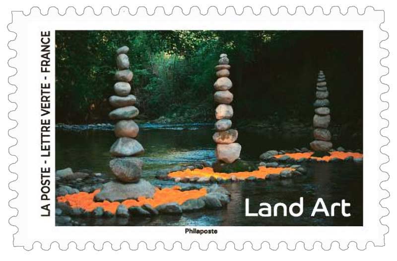 Visuel de la couverture : Titre : Land Art; la rencontre de la nature et de l'art sur un bosquet vert, en forme de coeur / Texte : "Loin de toute contrainte, le land art tisse de nouveaux liens avec le paysage, qui devient support de l’oeuvre d’art. Les matériaux offerts par la nature (galets, bois, sable, feuilles, etc…) inspirent à l'artiste des créations éphémères, dont seules les photos garderont la trace" sur des sucettes rouges fixées à l'extrémité de bâton installés dans l'herbe + le logo La Poste et le type de papier utilisé. / L'utilisation des timbres pour un affranchissement Lettre Verte et le code barre, sur une spirale de galets blancs, posée sur la roche.
