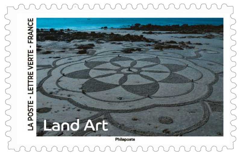 Visuel de la couverture : Titre : Land Art; la rencontre de la nature et de l'art sur un bosquet vert, en forme de coeur / Texte : "Loin de toute contrainte, le land art tisse de nouveaux liens avec le paysage, qui devient support de l’oeuvre d’art. Les matériaux offerts par la nature (galets, bois, sable, feuilles, etc…) inspirent à l'artiste des créations éphémères, dont seules les photos garderont la trace" sur des sucettes rouges fixées à l'extrémité de bâton installés dans l'herbe + le logo La Poste et le type de papier utilisé. / L'utilisation des timbres pour un affranchissement Lettre Verte et le code barre, sur une spirale de galets blancs, posée sur la roche.