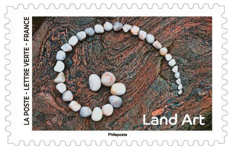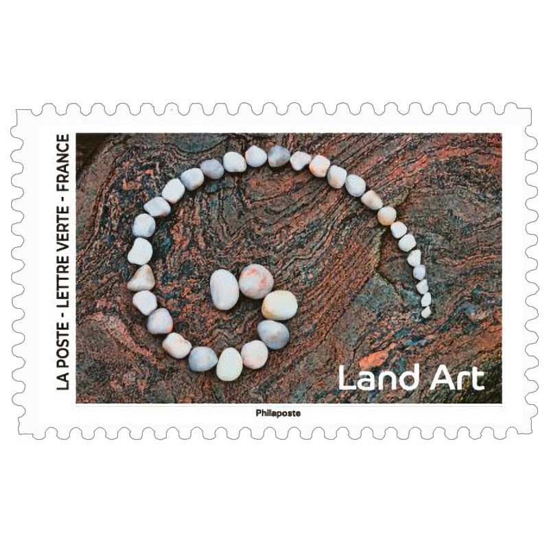 Visuel de la couverture : Titre : Land Art; la rencontre de la nature et de l'art sur un bosquet vert, en forme de coeur / Texte : "Loin de toute contrainte, le land art tisse de nouveaux liens avec le paysage, qui devient support de l’oeuvre d’art. Les matériaux offerts par la nature (galets, bois, sable, feuilles, etc…) inspirent à l'artiste des créations éphémères, dont seules les photos garderont la trace" sur des sucettes rouges fixées à l'extrémité de bâton installés dans l'herbe + le logo La Poste et le type de papier utilisé. / L'utilisation des timbres pour un affranchissement Lettre Verte et le code barre, sur une spirale de galets blancs, posée sur la roche.