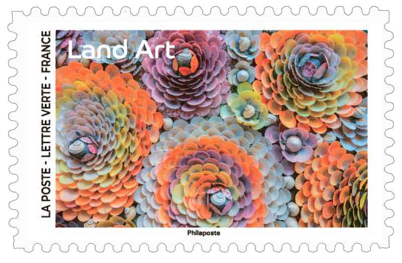 Visuel de la couverture : Titre : Land Art; la rencontre de la nature et de l'art sur un bosquet vert, en forme de coeur / Texte : "Loin de toute contrainte, le land art tisse de nouveaux liens avec le paysage, qui devient support de l’oeuvre d’art. Les matériaux offerts par la nature (galets, bois, sable, feuilles, etc…) inspirent à l'artiste des créations éphémères, dont seules les photos garderont la trace" sur des sucettes rouges fixées à l'extrémité de bâton installés dans l'herbe + le logo La Poste et le type de papier utilisé. / L'utilisation des timbres pour un affranchissement Lettre Verte et le code barre, sur une spirale de galets blancs, posée sur la roche.