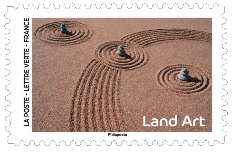 | Commentaire | Visuel de la couverture : Titre : Land Art; la rencontre de la nature et de l'art sur un bosquet vert, en forme de coeur / Texte : "Loin de toute contrainte, le land art tisse de nouveaux liens avec le paysage, qui devient support de l’oeuvre d’art. Les matériaux offerts par la nature (galets, bois, sable, feuilles, etc…) inspirent à l'artiste des créations éphémères, dont seules les photos garderont la trace" sur des sucettes rouges fixées à l'extrémité de bâton installés dans l'herbe + le logo La Poste et le type de papier utilisé. / L'utilisation des timbres pour un affranchissement Lettre Verte et le code barre, sur une spirale de galets blancs, posée sur la roche. |
