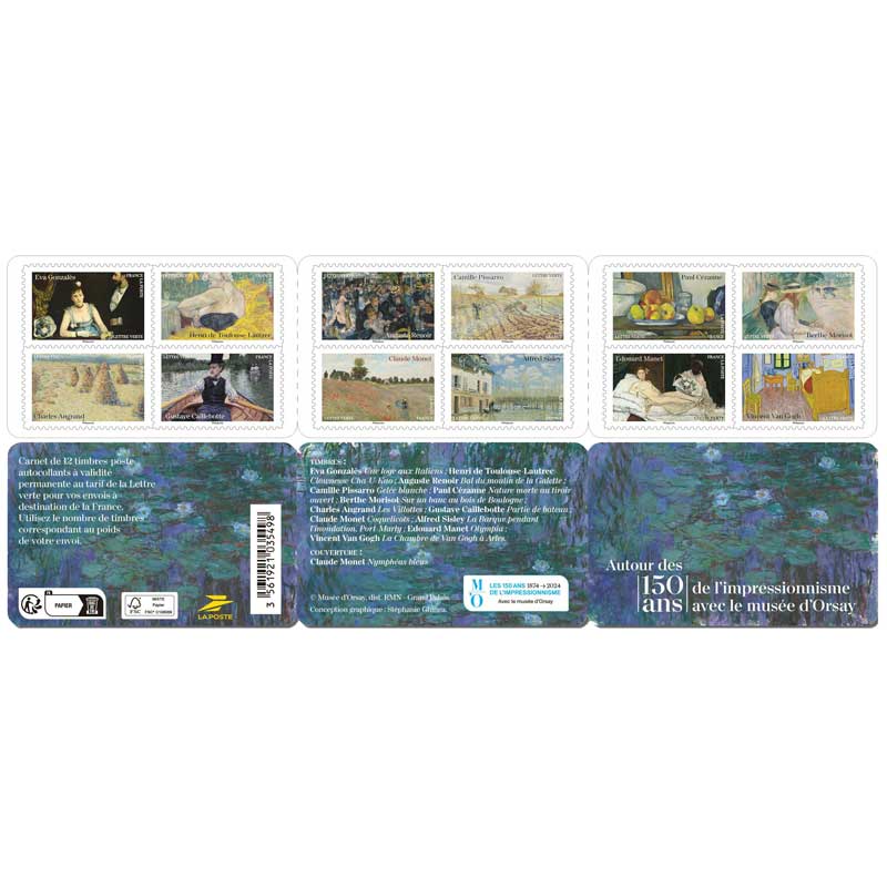| Description | Émission d'un carnet de douze timbres-poste, illustré par des oeuvres de peintres impressionnistes à l’occasion de la naissance de l’impressionnisme il y a 150 ans. |