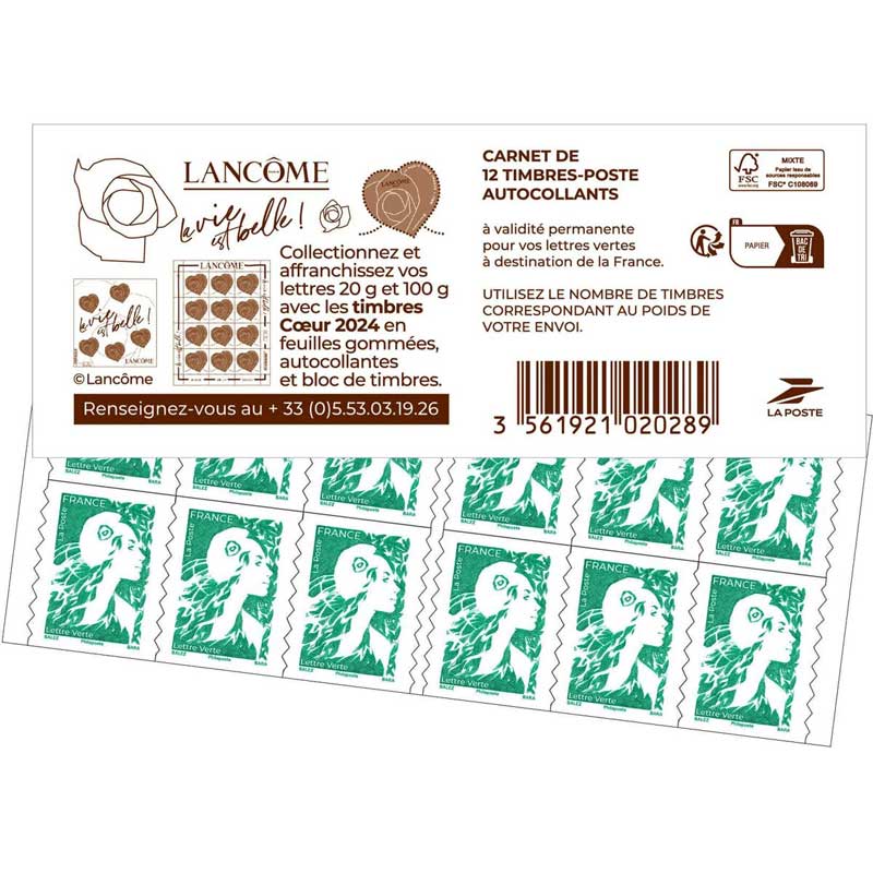 | Description | Carnet guichet de 12 timbres autoadhésifs pour lettres vertes de 20 g |