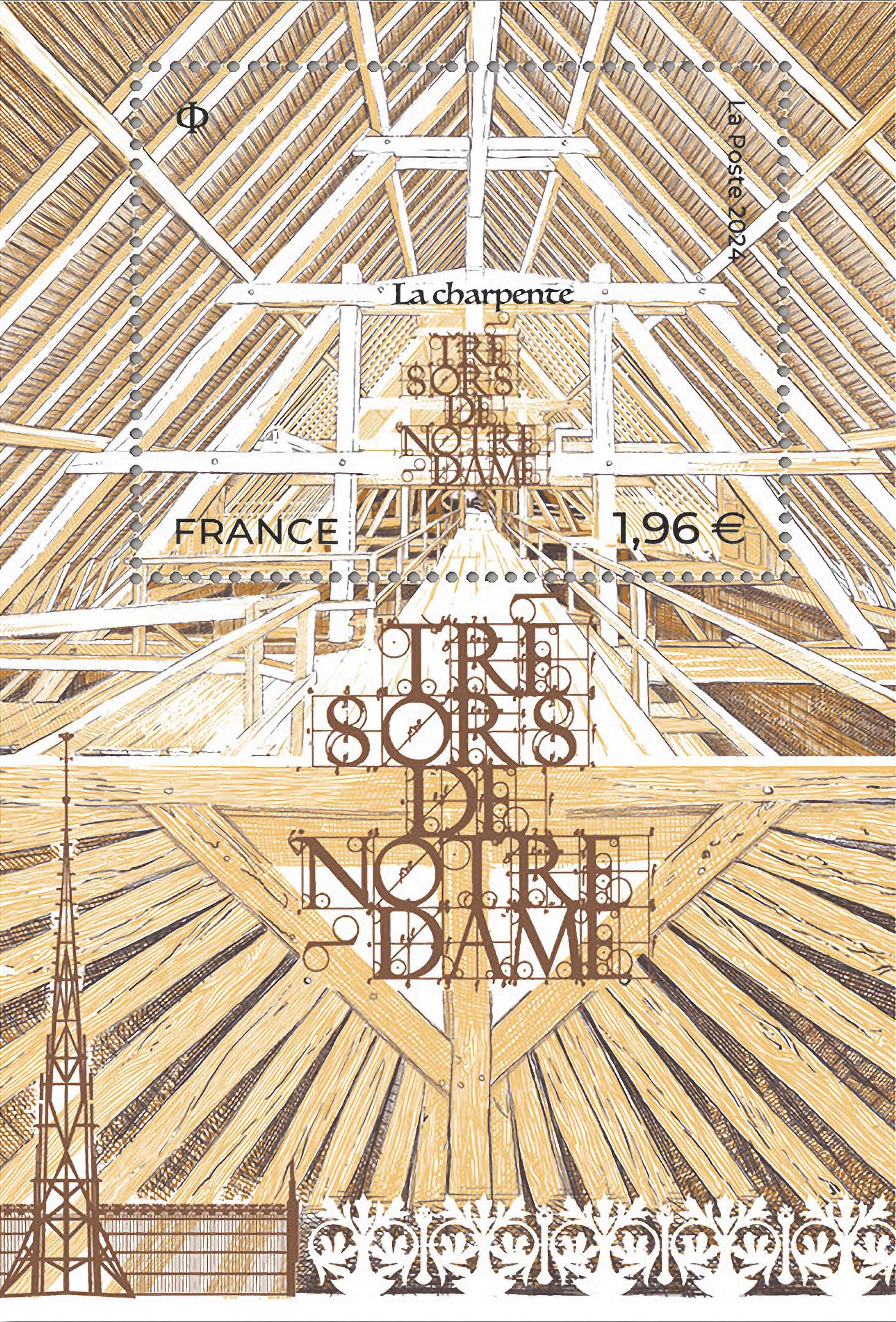 | Description | Émission d'un bloc de timbre « Trésors de Notre-Dame, la charpente ». Cette série initiée en 2020 met en lumière les trésors, les richesses et le patrimoine de la cathédrale durant toute la période de sa reconstruction. Ce bloc clôture ainsi cette série, la réouverture de la Cathédrale étant programmée en décembre 2024. |