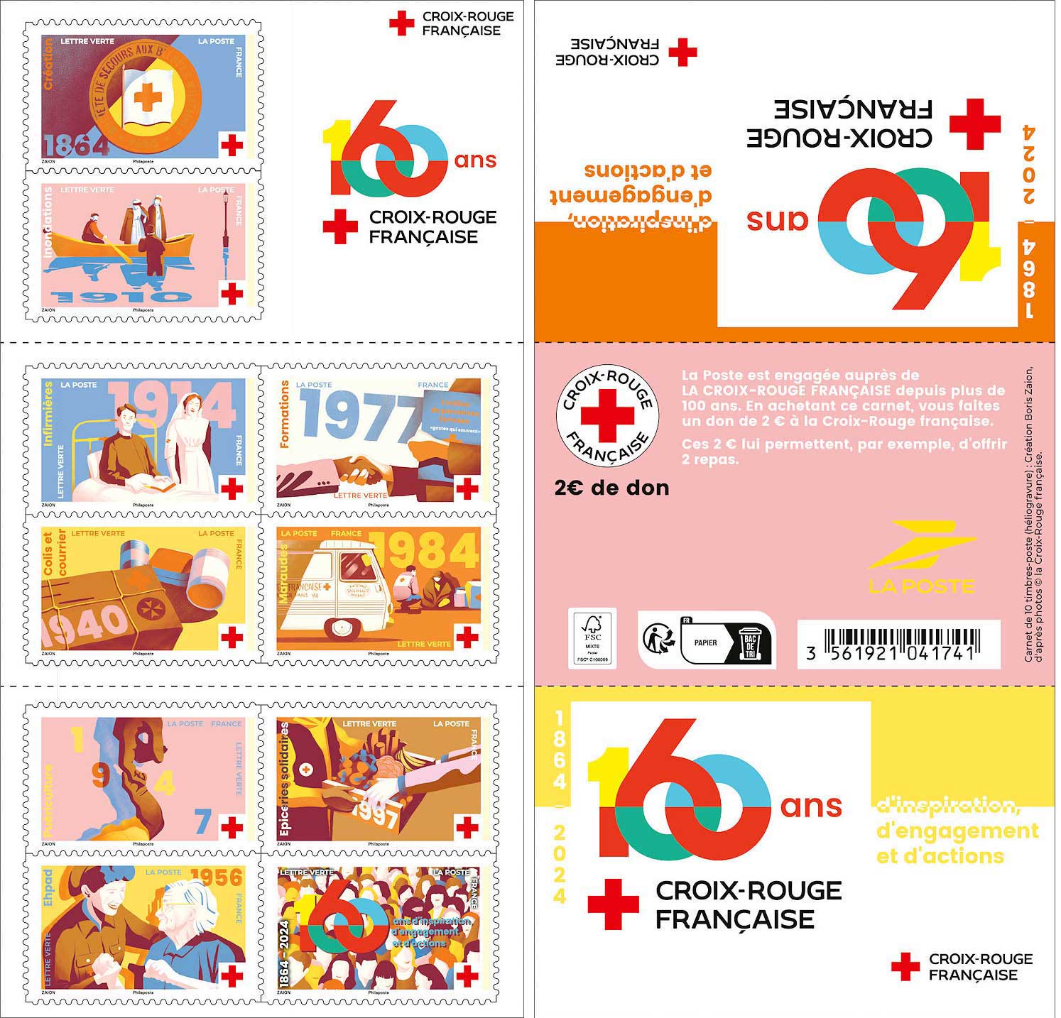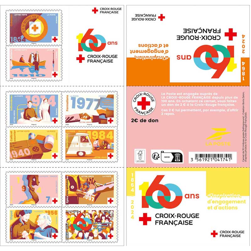 | Description | Émission d'un carnet de 10 timbres-poste qui célèbre les 160 ans de la Croix-Rouge française. Des timbres qui symbolisent des moments forts de son histoire. |
