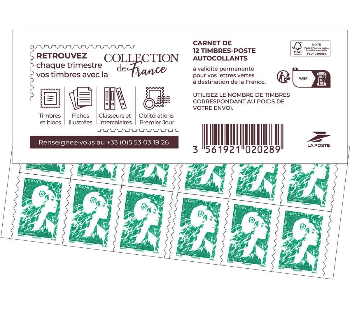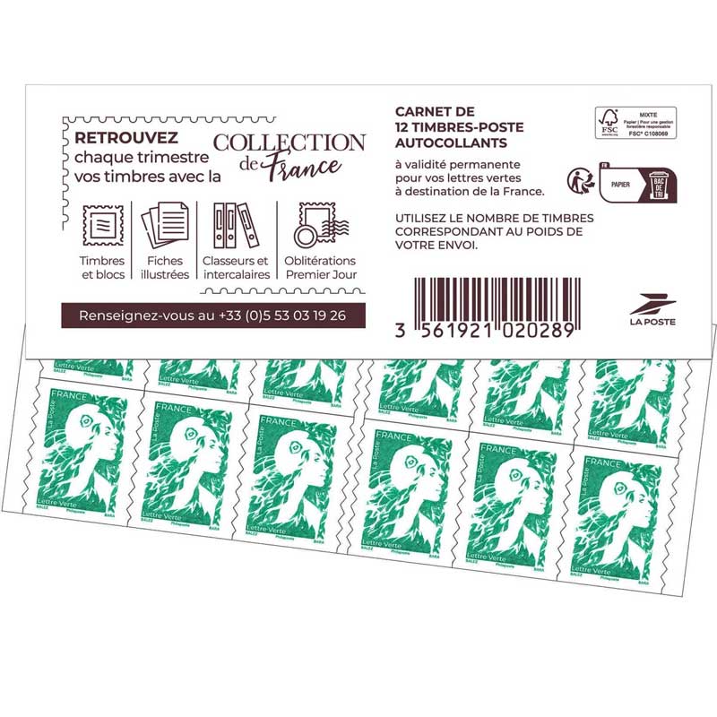 | Description | Carnet guichet de 12 timbres autoadhésifs pour lettres vertes de 20 g |