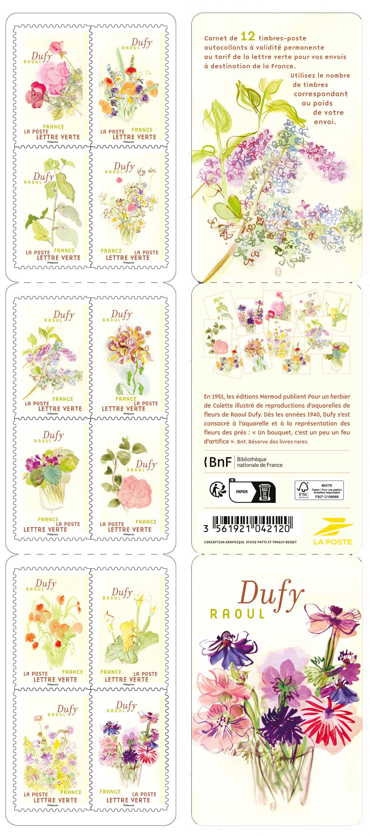 | Description | Émission d'un carnet de douze timbres-poste qui met en lumière des aquarelles de fleurs créées par Raoul DUFY. Elles ont illustré l’ouvrage de Colette, Pour un herbier. |