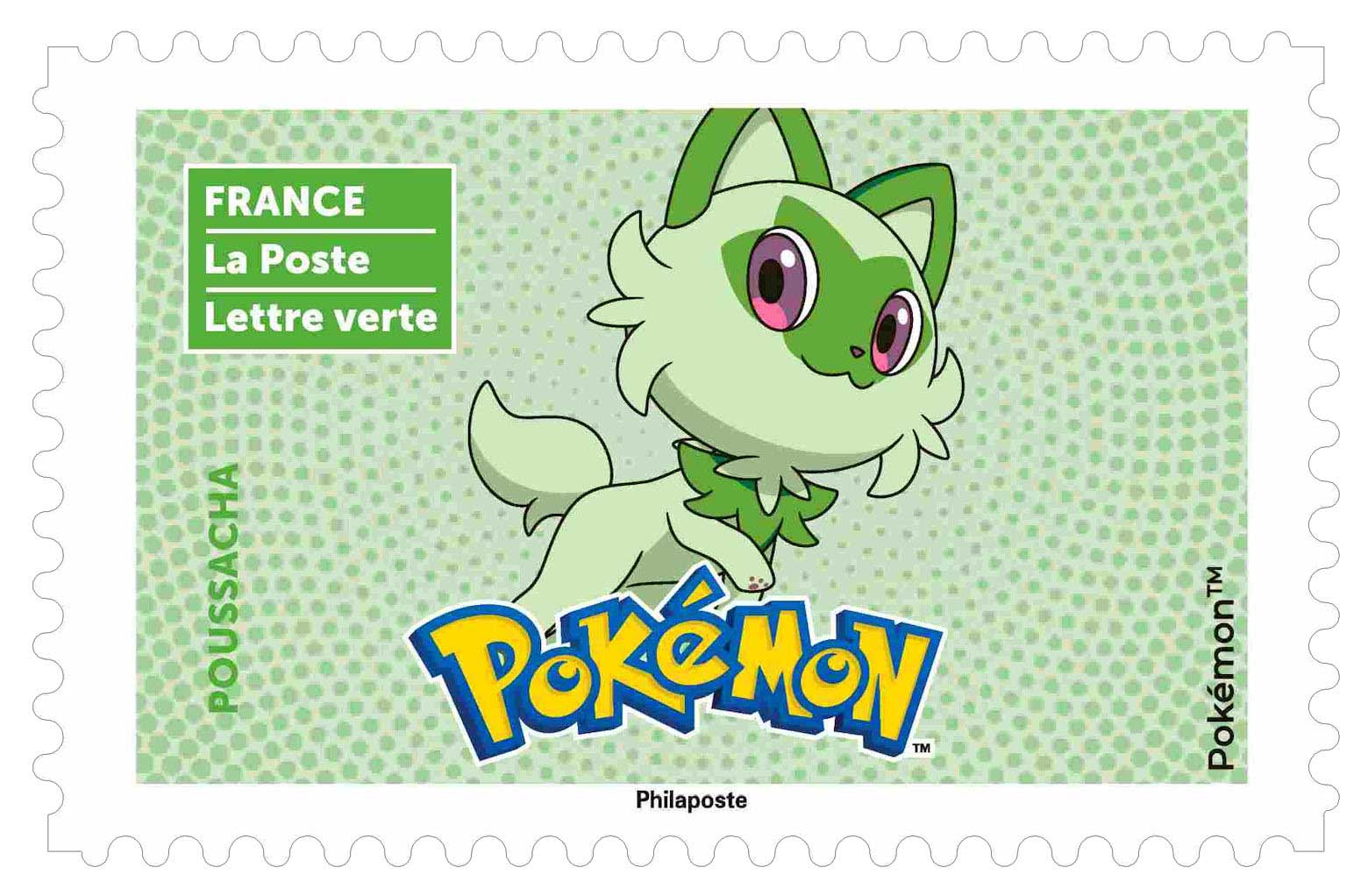 | Commentaire | En savoir plus sur Wikipédia : Pokémon Poussacha : Pokémon de type Plante de la neuvième génération. C'est le Pokémon de départ du type Plante des jeux Pokémon Écarlate et Violet. C'est un Pokémon quadrupède à l'apparence animale, qui ressemble à un chaton. Son corps possède majoritairement des traits fins, que l'on retrouve chez ses quatre pattes filiformes et sans griffe. Hormis quelques endroits spécifiques, l'entièreté du pelage recouvrant son organisme est vert clair. On retrouve également cette couleur sur sa queue épaisse et duveteuse. Une grosse touffe de fourrure couleur vert gazon prend la forme d'une feuille, tournée vers le bas, au niveau de son cou et de son torse. Sa tête est légèrement ovale ; hormis le vert clair dominant, une large marque vert foncé repré-sente une feuille sur son visage. Il possède sur chacune de ses deux joues trois mèches folles,
