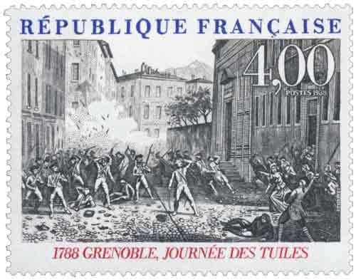 | Description | Bicentenaire de la Révolution. Philexfrance 89. Exposition philatélique mondiale. Représentation de la Journée des Tuiles, émeute du 7 juin 1788 à Grenoble, la population affronte à coup de tuiles les troupes royales |