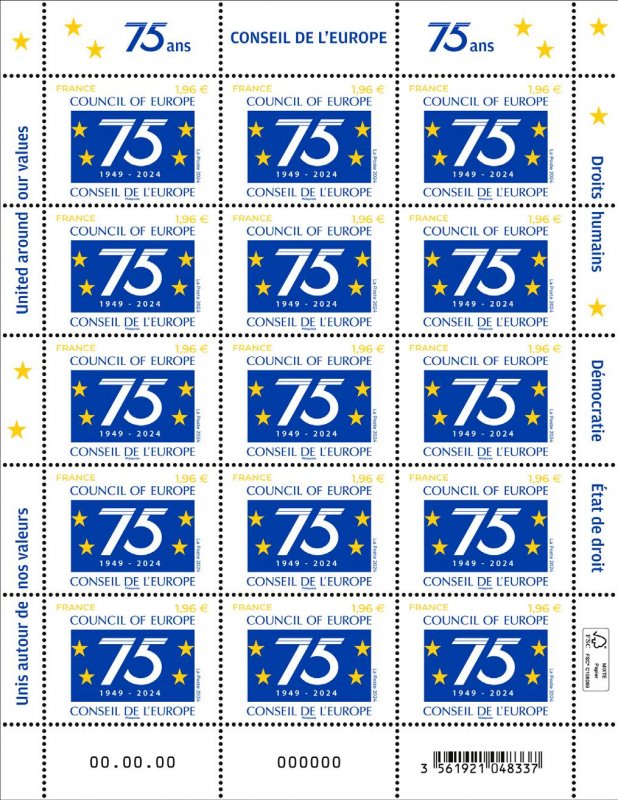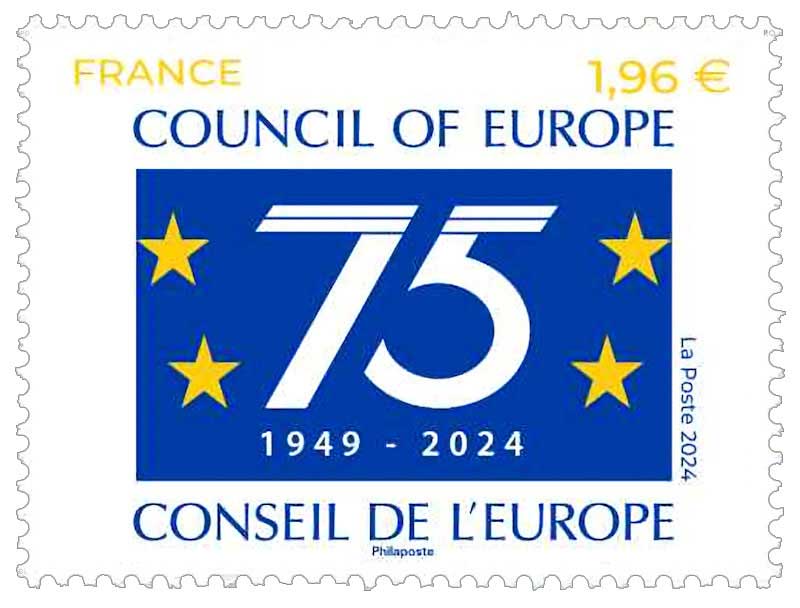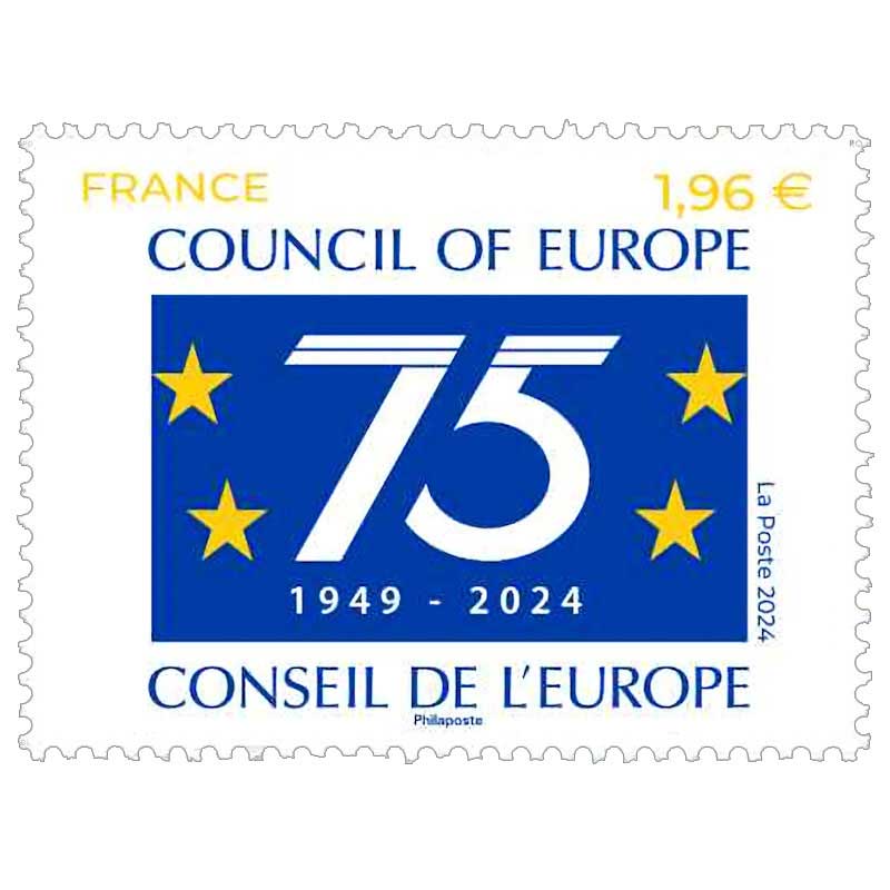 | Description | Émission d'un timbre de service pour affranchir les courriers au départ du Conseil de l'Europe qui célèbre son 75e anniversaire. |