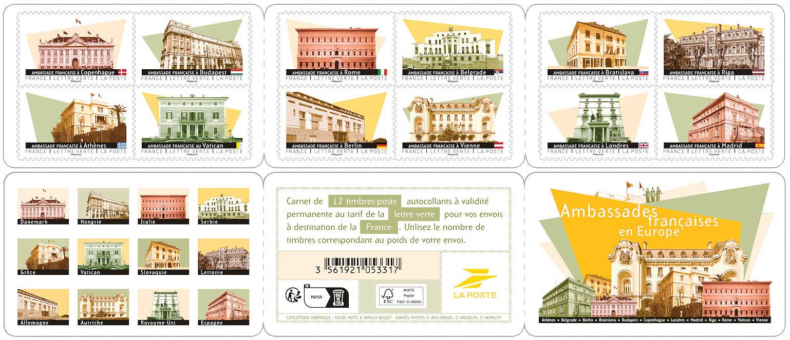 | Description | Émission d'un carnet de douze timbres-poste, à l’occasion des Journées européennes du patrimoine, qui nous permet de découvrir la richesse architecturale d’Ambassades françaises en Europe. |