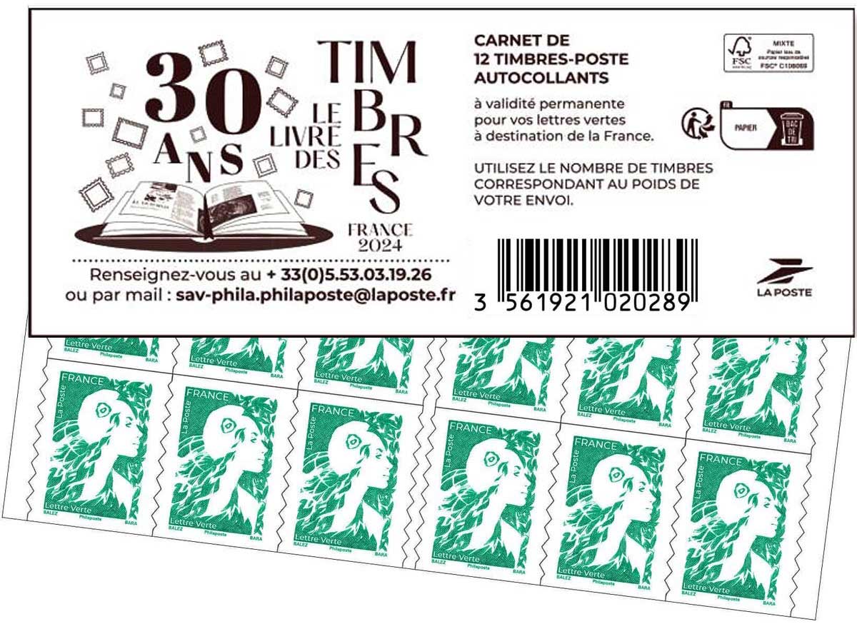 | Description | Carnet guichet de 12 timbres autoadhésifs pour lettres vertes de 20 g |