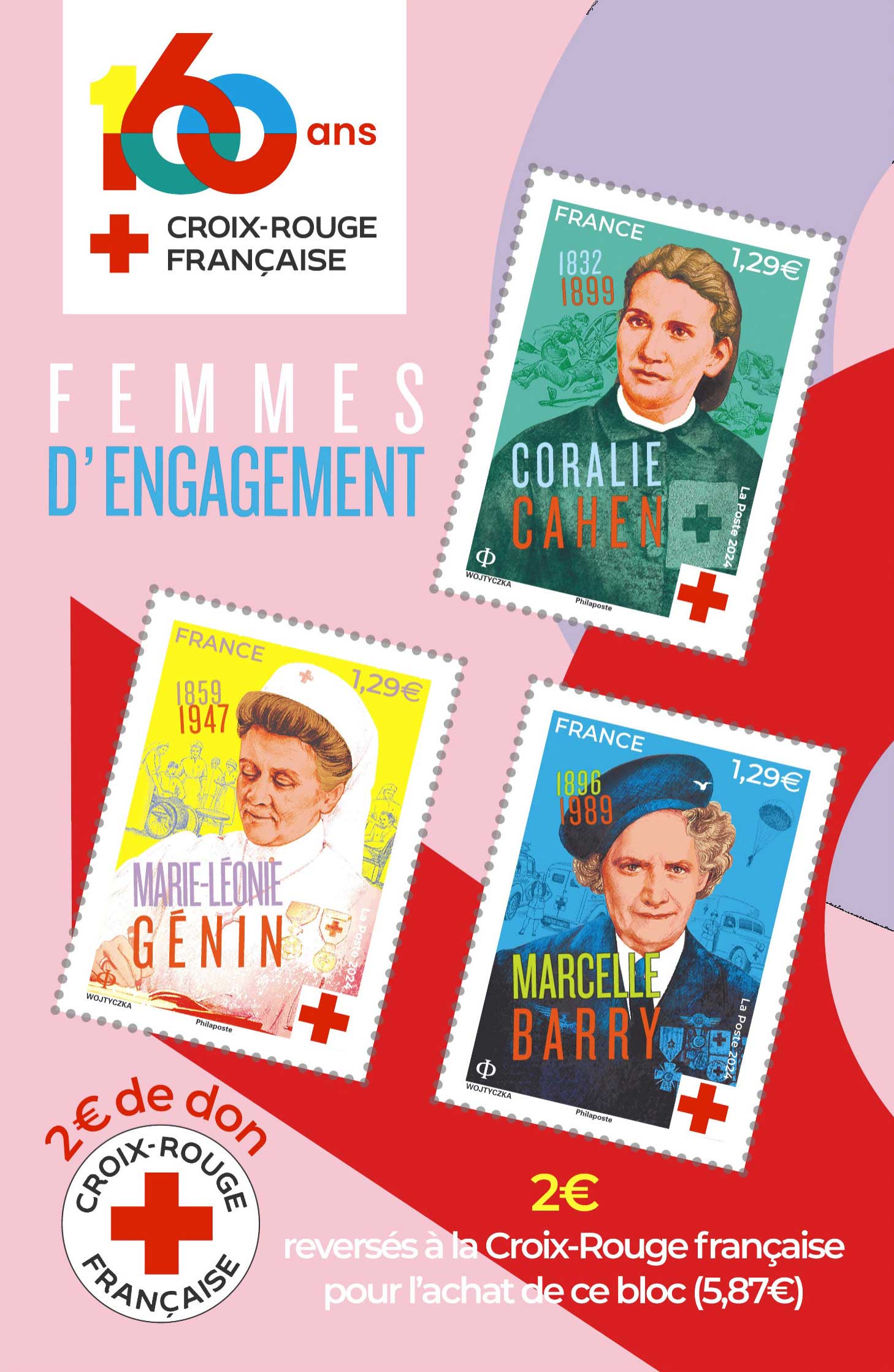 | Description | Émission d' un bloc composé de 3 timbres à l’occasion du 160e anniversaire de la création de la Croix-Rouge française. Ce bloc est illustré par le portrait de trois femmes qui ont joué un rôle décisif au sein de l’association, Coralie CAHEN, Marie-Léonie GÉNIN et Marcelle BARRY. |