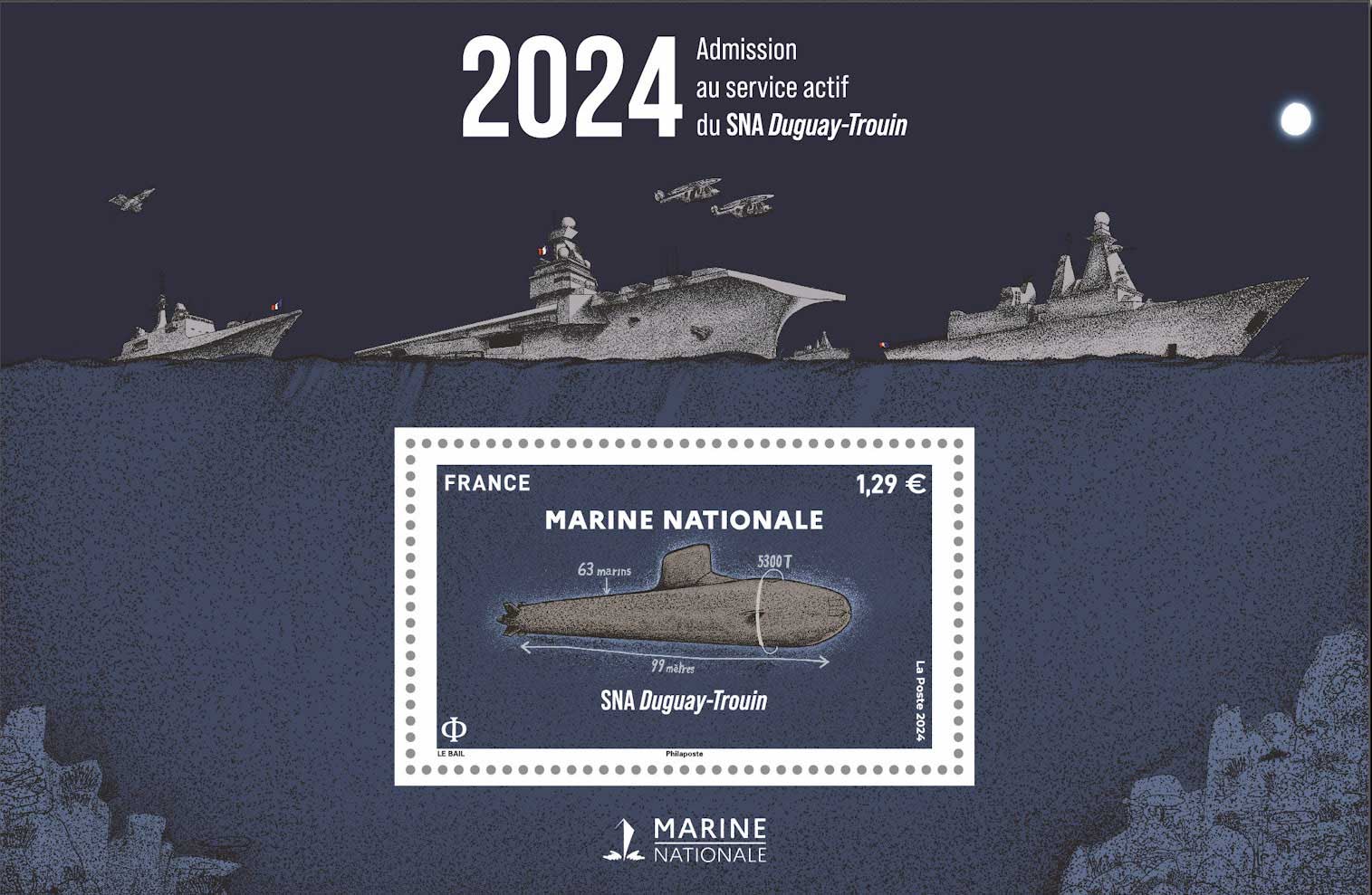 | Commentaire | Format du bloc : 130 x 85 mm Le timbre représente un monde d’acier et de silence, celui des profondeurs. Il illustre le SNA Duguay-Trouin, second sous-marin nucléaire d’attaque de nouvelle génération de la Marine nationale française, ici en plongée, profil tendu, lignes effilées, dans une ambiance quasi cinématographique. Le décor est minimal, mais dense : un bleu presque noir, quelques reflets métalliques, et cette impression nette que la machine avance, sans bruit, dans un monde où l’on n’entre pas. Émis en novembre 2024, ce timbre commémore l’entrée en service opérationnel du Duguay-Trouin, fleuron du programme Barracuda. Ce choix philatélique témoigne d’un attachement de La Poste à documenter les grands jalons de la défense nationale, et en particulier les évolutions technologiques de la Marine. Ce n’est pas seulement une célébration : c’est une forme de reconnaissance du savoir-faire naval français, discret mais décisif. Graphiquement, le traitement est moderne : jeu de contraste entre la masse sombre du submersible et les éclats argentés qui l’animent. La mise en page horizontale s’accorde parfaitement à la silhouette du bâtiment. Le nom du navire, bien visible, agit presque comme une signature. Le dessin est signé Julien Le-Bail, dans un style qui mêle rigueur technique et lisibilité postale. Imprimé en héliogravure avec ajout d’une couleur argent, le timbre (52 x 31 mm) est intégré à un bloc de 130 x 85 mm. Il est dentelé 13¼, possède une barre phosphorescente à droite, et permet l’affranchissement de la lettre verte jusqu’à 20 g. Le tirage annoncé est de 320 000 exemplaires. Une émission forte, marquant une époque où la dissuasion se conjugue à la perfection d’ingénierie. ©WikiTimbres |