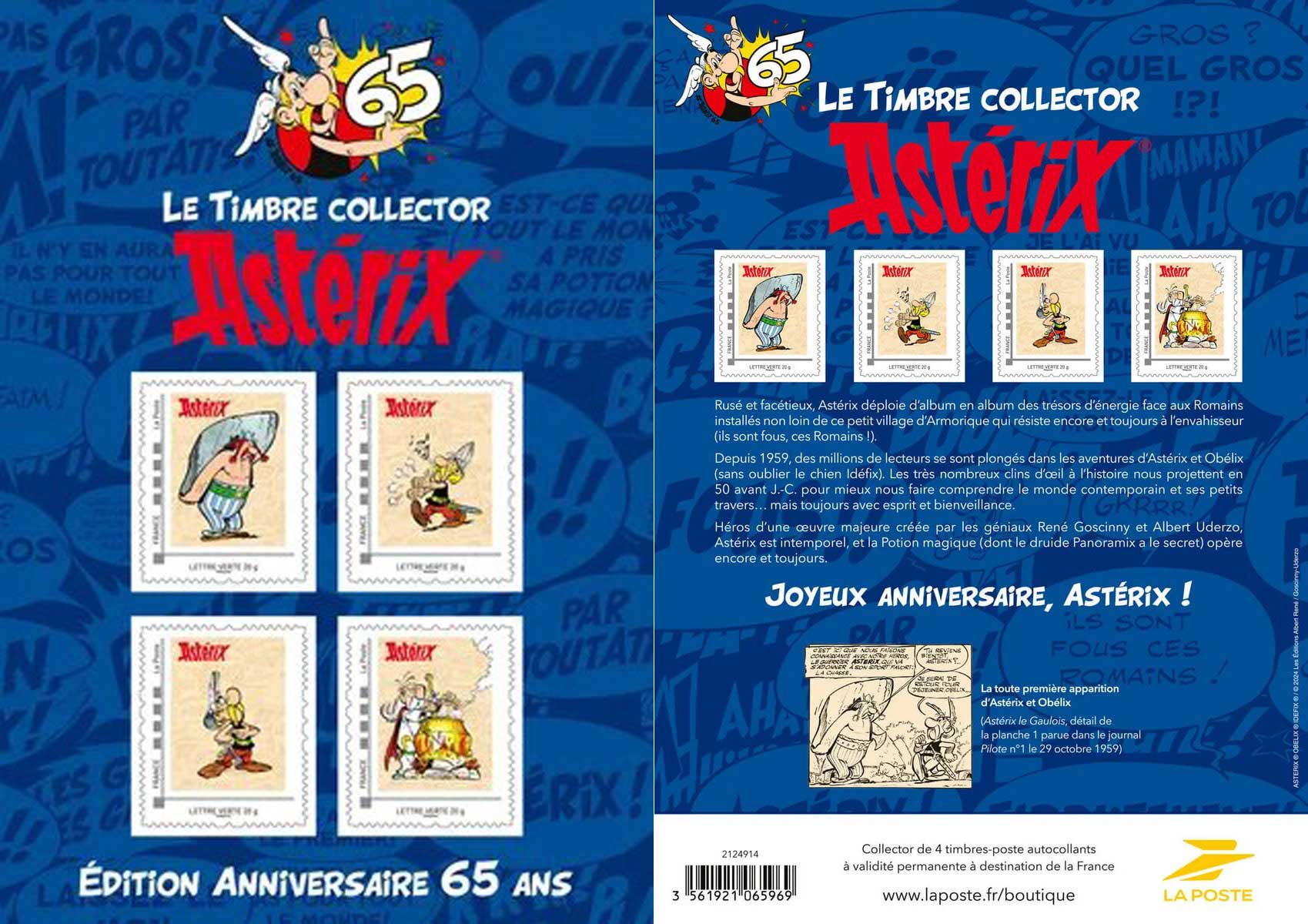 | Description | Émission d'un collector de quatre timbres à l’occasion du 65e anniversaire de la création d’Astérix par le scénariste René Goscinny et le dessinateur Albert Uderzo. |