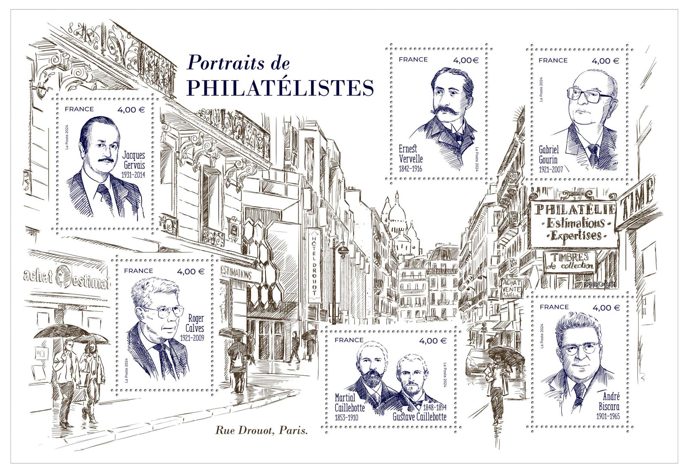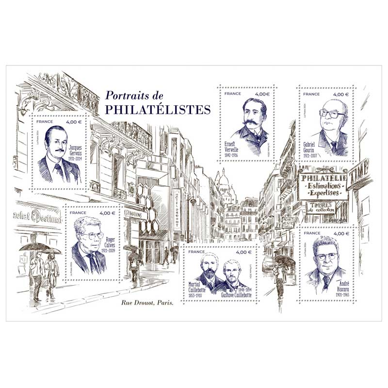 | Description | Émission d'un bloc de 6 timbres qui rend hommage à des grands philatélistes. |