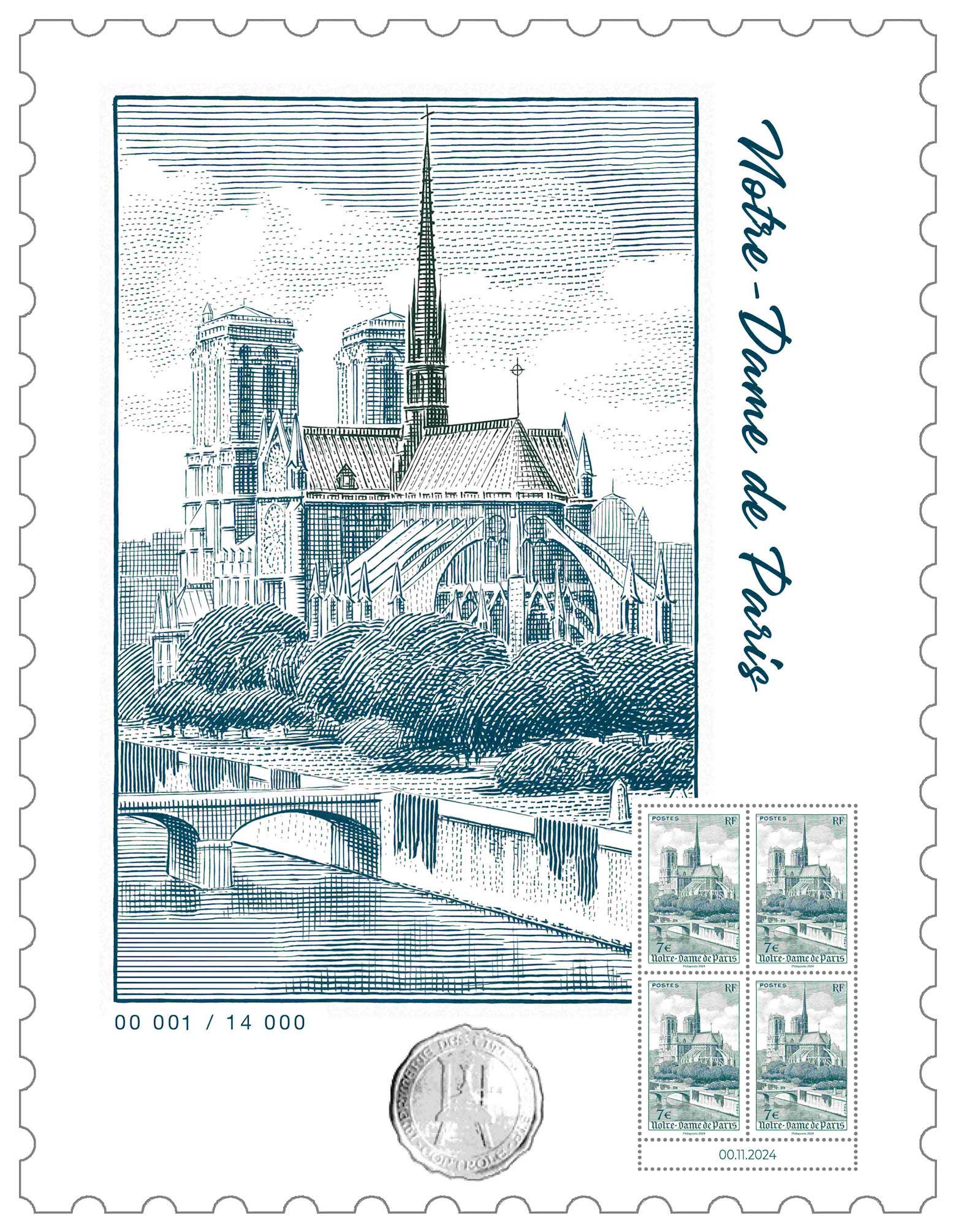 | Description | La cathédrale restaurée s’apprête à rouvrir ses portes au public le 8 décembre 2024. Pour marquer cet événement, La Poste vous propose une affiche mettant à l’honneur une réimpression du timbre « Notre-Dame de Paris » de 1947, dessiné et gravé par Jules PIEL. |