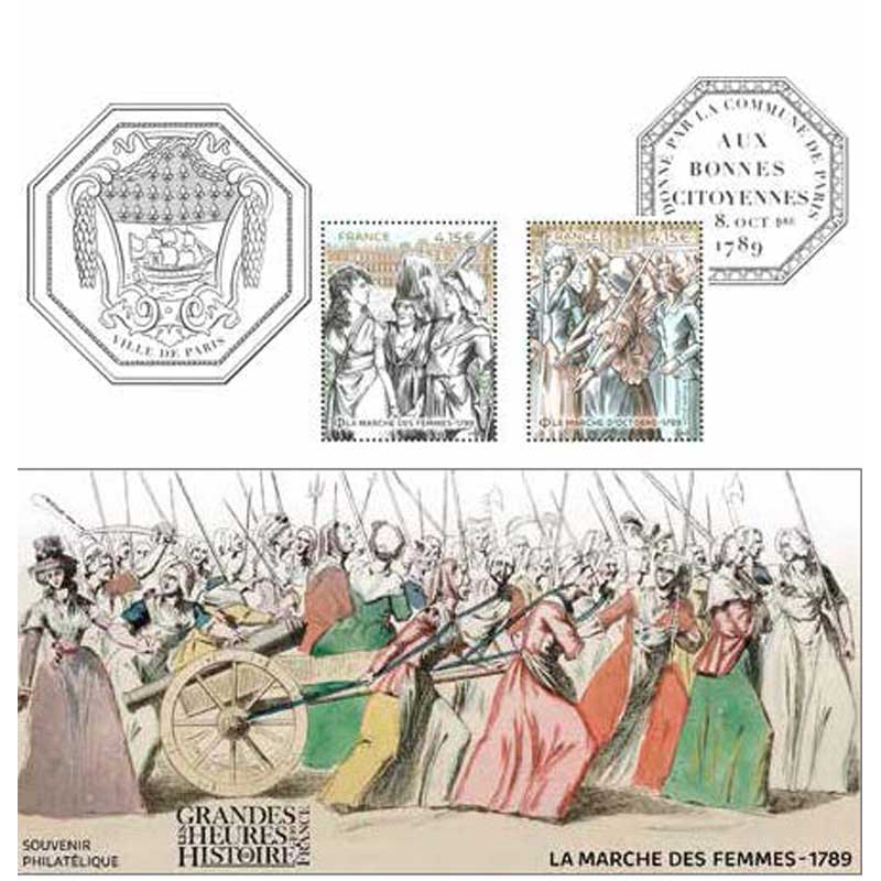 | Description | Émission d'un bloc souvenir dans la série les Grandes Heures de l’Histoire de France, illustré par deux timbres sur la marche des femmes à Versailles le 5 octobre 1789 qui précipita la fin du règne de Louis XVI. |