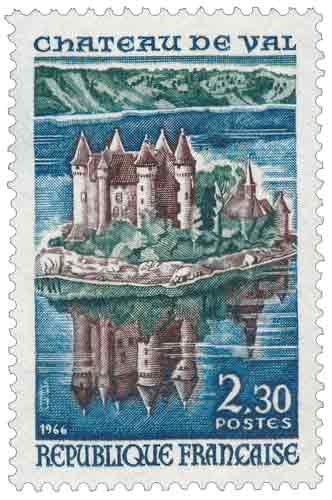 | Commentaire | Ce timbre est créé pour le nouveau tarif du recommandé qui passe de 1F30 à 2F30, le 1er aôut 1966. Tu vois ce château tout droit sorti d’un conte, posé sur un îlot au beau milieu d’un immense lac auvergnat ? Eh bien, il ne l’a pas toujours été. Le château deVal, c’est un drôle de rescapé. À l’origine, perché sur un éperon rocheux stratégique, il dominait fièrement la vallée de la Dordogne. Mais dans les années 50, quand on a mis en eau le barrage de Bort-les-Orgues, paf — voilà qu’il se retrouve cerné par les flots. Résultat : aujourd’hui, on n’y accède plus que par une jetée. Ça a des airs de Venise rurale… ou presque. Construit au XVe siècle par Guillaume IV d’Estaing sur les ruines d’une forteresse médiévale, le château allie la robustesse militaire (six tours, machicoulis, poivrières…) et un confort d’habitation assez inattendu pour l’époque. À l’intérieur, bon, tout n’a pas survécu aux restaurations enthousiastes du XIXe siècle, mais l’oratoire et l’escalier en colimaçon valent franchement le coup d’œil. Et puis y’a cette chapelle gothique, comme blottie contre lui, toute fine avec son clocheton pointu… presque mignonne, si on ose dire ça d’une construction du XVe. Ah, et tiens, anecdote rigolote : l’endroit appartient à la ville de Bort-les-Orgues, même s’il est physiquement… dans une autre commune (Lanobre, côté Cantal). Typique des histoires de clocher françaises, non ? Dans la cour, on tombe aussi sur des vestiges gallo-romains : une lionne-fontaine, une vasque et même une borne milliaire, preuve qu’une voie romaine passait par là — Clermont-Aurillac, pour les curieux. Aujourd’hui encore, des expositions et concerts y sont organisés. Certains disent que le château a perdu sa superbe, noyé dans son décor. D’autres y voient un refuge poétique suspendu entre deux époques. Qui a raison ? On laisse ça à ton imagination. WikiTimbres |