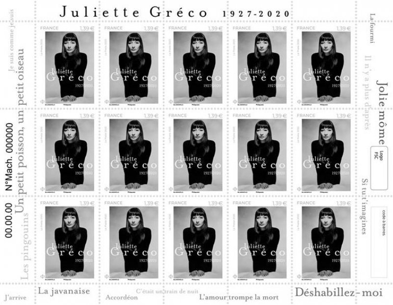 | Description | Émission d'un timbre en hommage à Juliette Gréco, disparue il y a cinq ans. Chanteuse, interprète des plus grands auteurs français, actrice, femme de convictions. Pendant 70 ans, elle contribua au rayonnement de la culture française dans le Monde, de ce fait, elle reçût toutes les distinctions de la République. |