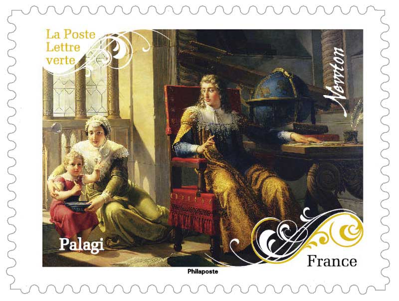 | Commentaire | Dans ce timbre, issu du carnet « Autour du Monde », l’objet prend le pas sur le portrait. Un globe en volume, richement illustré, repose aux côtés de Newton, gravure classique tirée d’une œuvre de Pelagio Palagi, peintre italien du XIXe siècle. Le choix est habile : plutôt que de représenter Newton seul, figé dans son rôle de savant, le visuel met en scène un espace de pensée, une atmosphère de recherche. On perçoit dans cette composition une volonté d’équilibre : entre science et art, entre représentation et abstraction. La lumière adoucie, les teintes chaleureuses et l’ombre portée du globe donnent de la profondeur à l’image. Le globe, sans être détaillé à l’extrême, évoque une époque où la connaissance du monde passait par l’observation, le dessin, la mesure. Émis en novembre 2024, ce timbre célèbre la figure tutélaire d’Isaac Newton, mais aussi l’élan d’un siècle où science, curiosité et esthétique ne faisaient qu’un. En cela, il s’inscrit pleinement dans l’esprit du carnet dont il est issu, qui rassemble douze œuvres autour du globe terrestre en tant qu’objet de savoir. Techniquement, il est imprimé en héliogravure sur papier autoadhésif, format 40 x 30 mm, dentelure 11. Il affranchit les lettres vertes jusqu’à 20 g et a été tiré à 150 000 exemplaires. L’illustration et la mise en page sont signées Corinne Salvi, qui réussit ici à conjuguer exactitude iconographique et sens de la mise en scène. Pour les amateurs de sciences, d’art graphique ou d’histoire des idées, ce timbre coche toutes les cases : à la fois discret et porteur de sens, il s’impose comme une pièce à part entière dans toute collection sur les grands penseurs. ©WikiTimbres |