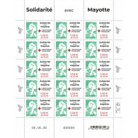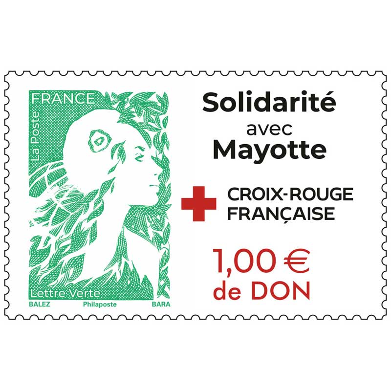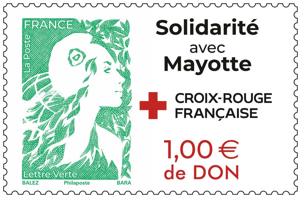 | Description | Émission d'un timbre à dons d’une valeur de 2,39 euros intégrant un don d’un euro au profit de la Croix-Rouge française, dont elle est partenaire depuis plus de 100 ans. Ce timbre est composé de la Marianne associée à un message de solidarité pour Mayotte. |