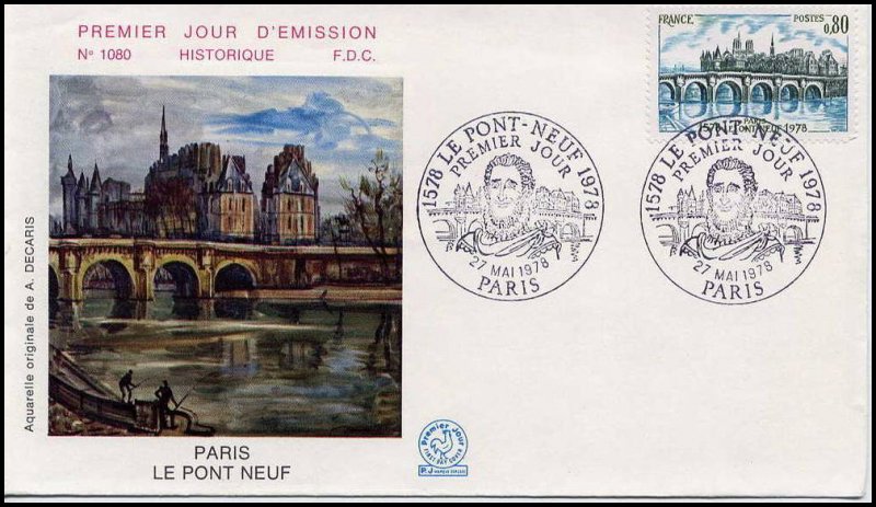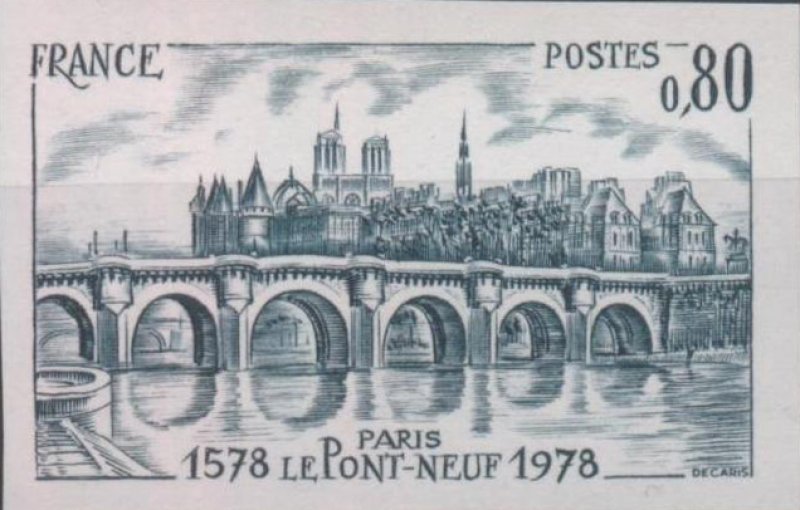 | Commentaire | Hommage à l'artiste : avec ce TP, Albert DECARIS reçoit le grand prix de l'Art Philatélique en 1978. Visuel : le Pont-Neuf de Paris (1578-1607, architectes Baptiste (1544-1602), Jacques II (1550-1614) Androuet du Cerceau) et Thibault Métezeau (1533-1596). Le plus ancien pont de Paris (long. 238 m x larg. 20,50 m), relie les deux rives de la Seine, en coupant la pointe Ouest de l'île de la Cité. Depuis la rive droite, quai François Mitterrand, les arches et les piles avec balcons en demi-cercles du pont en maçonnerie, en décor de fond, les pavillons jumelés ouvrant l'accès à la nouvelle Place Dauphine, la Conciergerie, le clocher de la Sainte-Chapelle et les deux tours de la cathédrale Notre-Dame de Paris |
