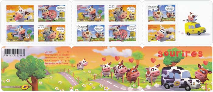 | Commentaire | SOURIRES Alexis Nesme a réalisé un carnet humoristique illustré de sympathiques vaches avec le corps recouvert de timbres |