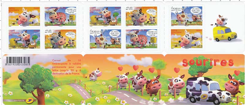 | Commentaire | SOURIRES Alexis Nesme a réalisé un carnet humoristique illustré de sympathiques vaches avec le corps recouvert de timbres |