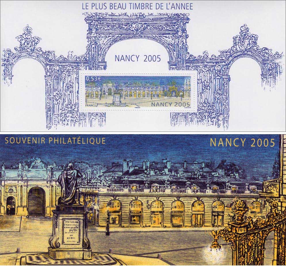 | Description | Nancy 2005, La place Stanislas avec la statue de Stanislas 1er Leszczynski, duc de Lorraine (3785a). Feuillet de 207x95. Légende Phil@poste (au lieu d'ITVF). |