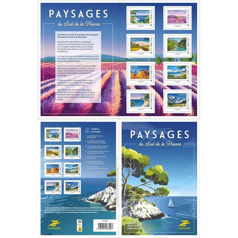 Timbre : 2025 Paysages du Sud de la France Mesures Format d'imp 143 x 210 mm Dents incluses 143 x 210 mm Forme vertical Phosphore 1 barre à droite Impression Numérique Complément xxxxx Couleur quadrichromie Valeur 14 € Dentelure Spéciale MTAM Emis en bloc-feuillet de 8 TP Quantité 10 000 Auteurs Dessinateur xxxxx Graveur xxxxx Mise en page xxxxx Mentions La poste Numéros & Dates N° Philatelix - N° Michel - Date d'émission 07/04/2025 Date de retrait - Classements Groupe Collector 2025 Catégorie Collectors MTAM Familles paysage nature Usage Lettre verte 20 g Régions - Départements - Description Émission d'un collector 8 timbres - Lettre Verte Commentaire - Mes timbres & notes personnelles www.wikitimbres.fr