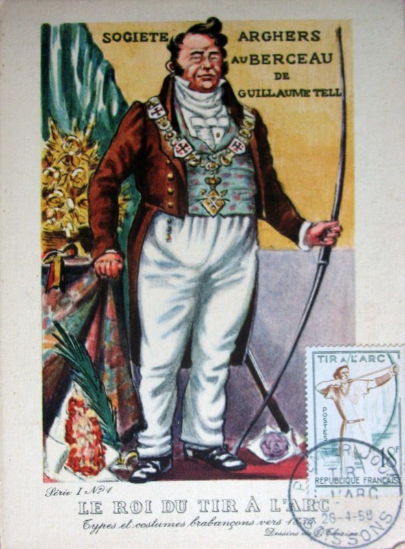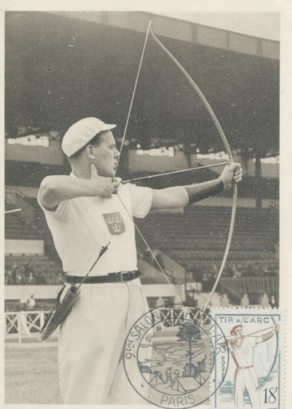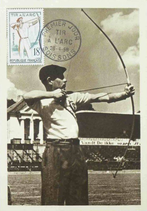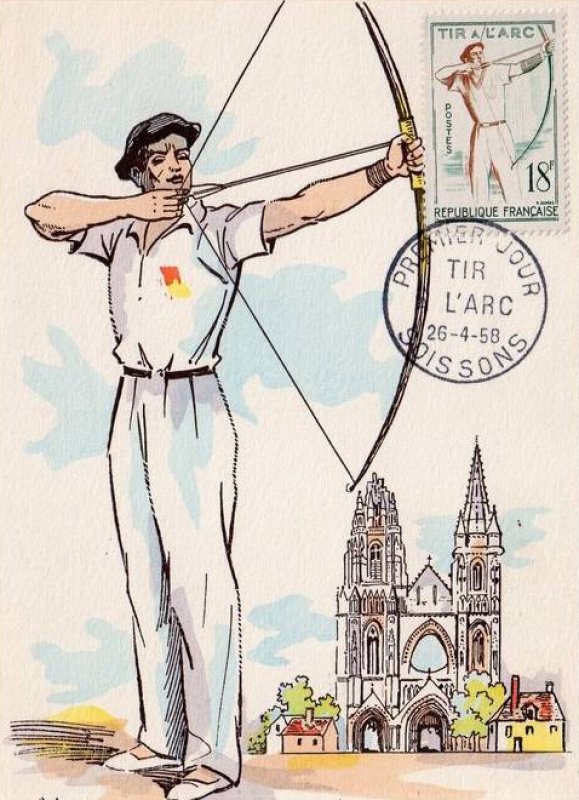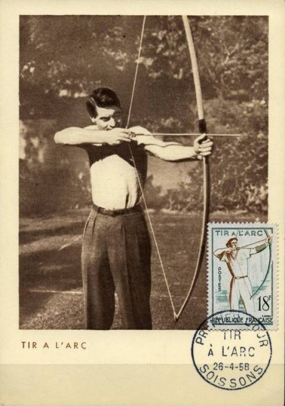 | Commentaire | Les recherches archéologiques ont permis la découverte de fragments d'arcs et de flèches conservés dans des tourbières datant de la fin du Paléolithique supérieur. Toutefois il existe de forte présomption de l'usage de l'arc dès les phases anciennes de cette période de la Préhistoire. Apollon est le dieu des archers, considéré métaphoriquement comme tirant des flèches invisibles. Artémis (Diane), déesse des zones sauvages et de la chasse, et Éros (Cupidon), dieu de l'amour, sont souvent représentés avec un arc. Les archers sont des divinités ou des héros dans plusieurs autres mythologies. Visuel : Le tir à l'arc est apparu pour la première fois aux Jeux Olympiques en 1900 et a été reconduit en 1904 – 1908 et 1920. Aux J.O. de 1904, le tir à l'arc fut l'un des premiers sports à inclure des femmes. |