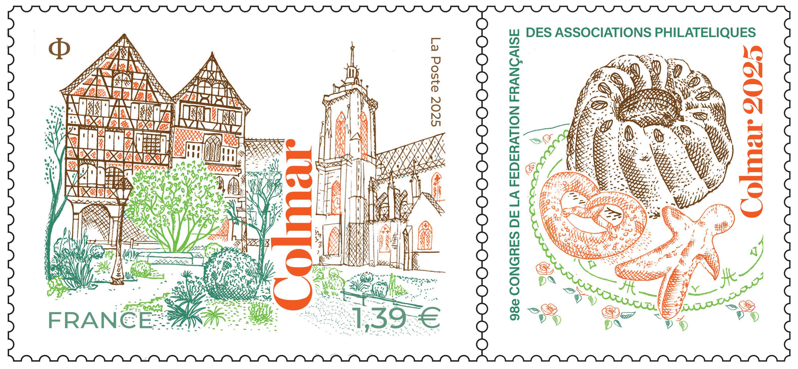 | Description | Émission d'un timbre illustré par la place de la Cathédrale de Colmar, avec une vignette attenante sur laquelle figurent des spécialités alsaciennes, à l’occasion du 98e Congrès de la FFAP. |