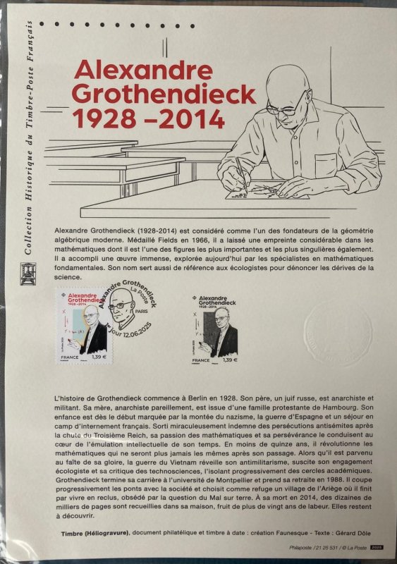 | Description | Emission d'un timbre à l’effigie d’Alexandre Grothendieck considéré comme l’un des fondateurs de la géométrie algébrique moderne. Il est reconnu comme l'un des plus grands mathématiciens du XXe siècle, que ce soit par son génie ou ses réflexions sur son temps. La médaille Fields lui a été décernée en 1966. |