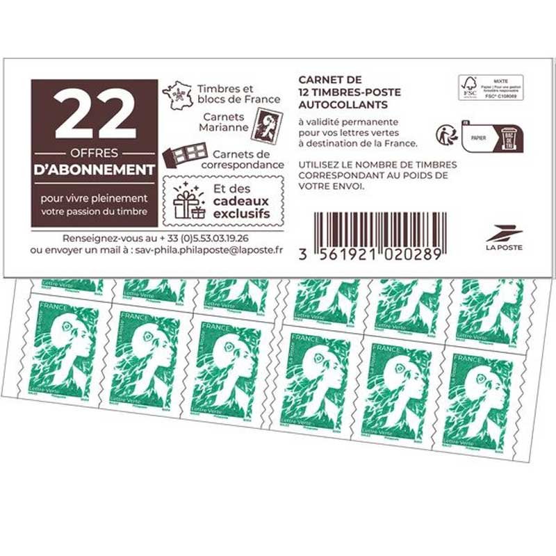 | Description | Carnet guichet - Offres d'abonnement - de 12 timbres autoadhésifs pour lettres vertes de 20 g |