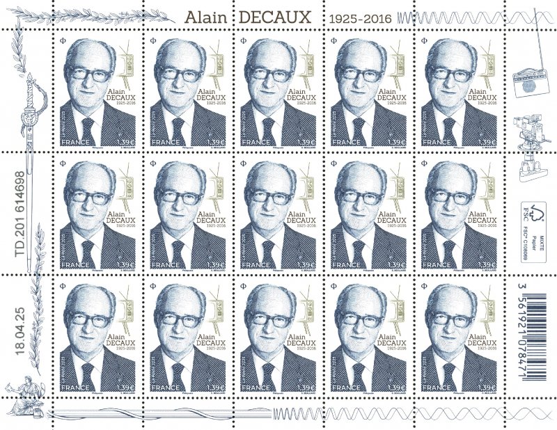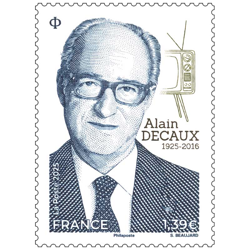 | Description | Émission d'un timbre à l’effigie d’Alain DECAUX, historien, écrivain, journaliste et homme de télévision français, élu à l'Académie française en 1979, à l’occasion du centenaire de sa naissance. |