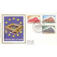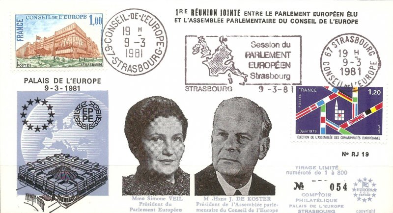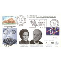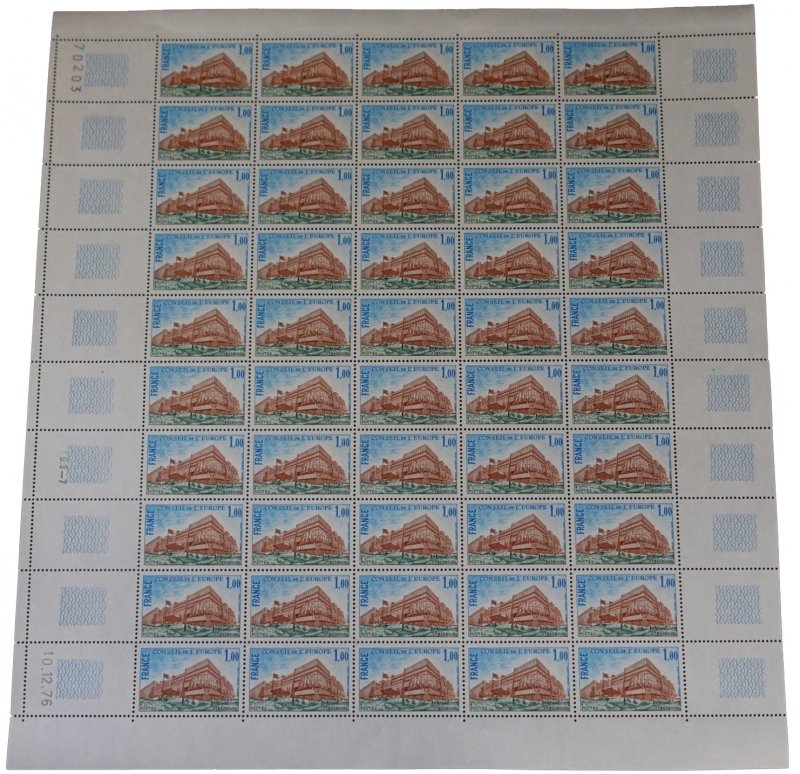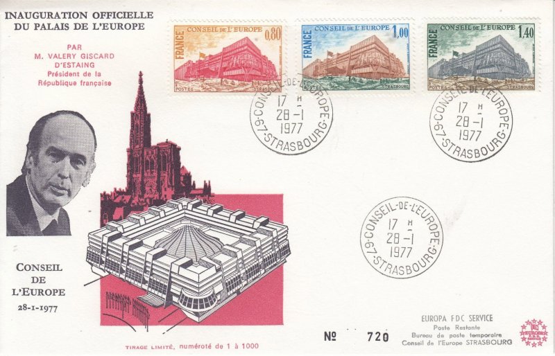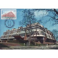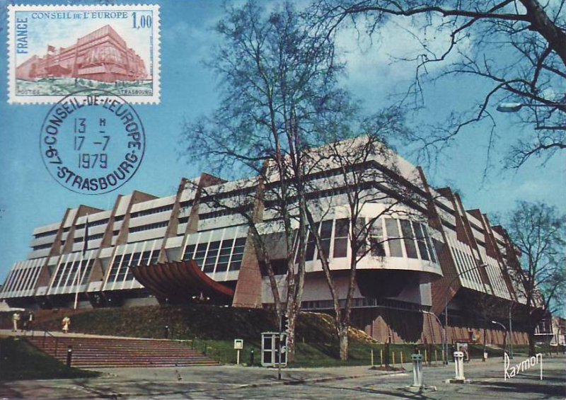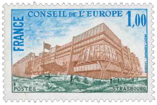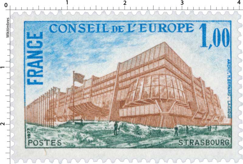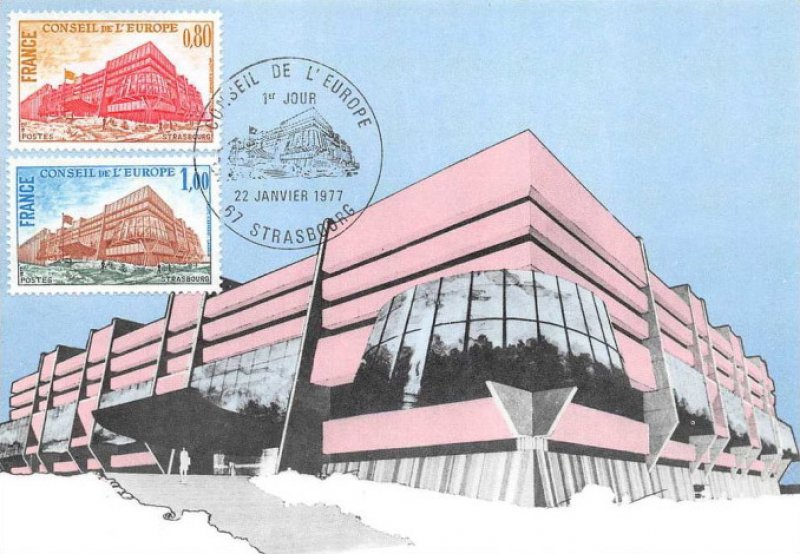 | Commentaire | Visuel : le Palais du Conseil de l'Europe à Strasbourg (1976-1977), architecte, Henri BERNARD (fév.1912 - déc.1994, urbaniste) - 106 m de côté / 38 m de Ht.. Sa surface totale est de 64 000 mètres carrés. Il comprend dix-sept salles de réunions et une centaine de bureaux pour le personnel du secrétariat du Conseil de l'Europe ainsi que l'hémicycle de l'Assemblée parlementaire. L'extérieur du bâtiment est rouge, argent et brun. |