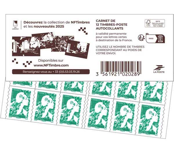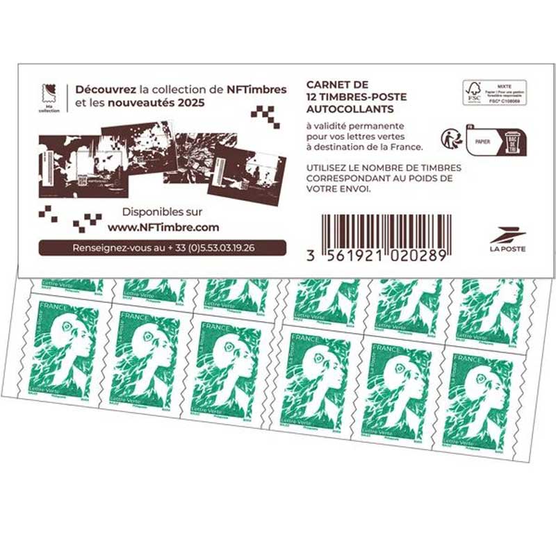 | Description | Carnet guichet - NFTimbres - de 12 timbres autoadhésifs pour lettres vertes de 20 g |