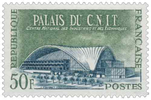 | Commentaire | Le timbre émis en 1959 consacré au Palais du C.N.I.T. s’inscrit pleinement dans la série des Réalisations techniques françaises, dont l’objectif est de mettre en valeur les grandes réussites industrielles, scientifiques et architecturales de la France d’après-guerre, à un moment où le pays affirme sa modernisation rapide et sa capacité d’innovation. Inauguré en 1958 à l’occasion des Floralies internationales, le Centre national des industries et des techniques constitue alors une œuvre architecturale sans équivalent : édifié sur une parcelle triangulaire aux portes de Paris, il impressionne par sa structure audacieuse, couvrant une surface exceptionnelle sans appui intérieur, véritable démonstration de maîtrise technique et d’ingénierie moderne. À travers ce choix iconographique, l’administration des Postes souligne la naissance du quartier de La Défense comme nouveau pôle économique et industriel, appelé à prolonger symboliquement l’axe historique parisien au-delà de l’Arc de Triomphe. Le CNIT n’est pas seulement un bâtiment spectaculaire ; il incarne la volonté de faire dialoguer industrie, innovation et rayonnement national, en offrant un lieu destiné aux grandes expositions, aux rencontres économiques et à la diffusion du progrès technique. En le représentant sur un timbre-poste, support de circulation quotidienne, la Poste participe à cette pédagogie du progrès en donnant à voir, à l’échelle du pays et au-delà, l’image d’une France tournée vers l’avenir, confiante dans ses capacités scientifiques et industrielles à la veille des profondes mutations économiques des années 1960. |