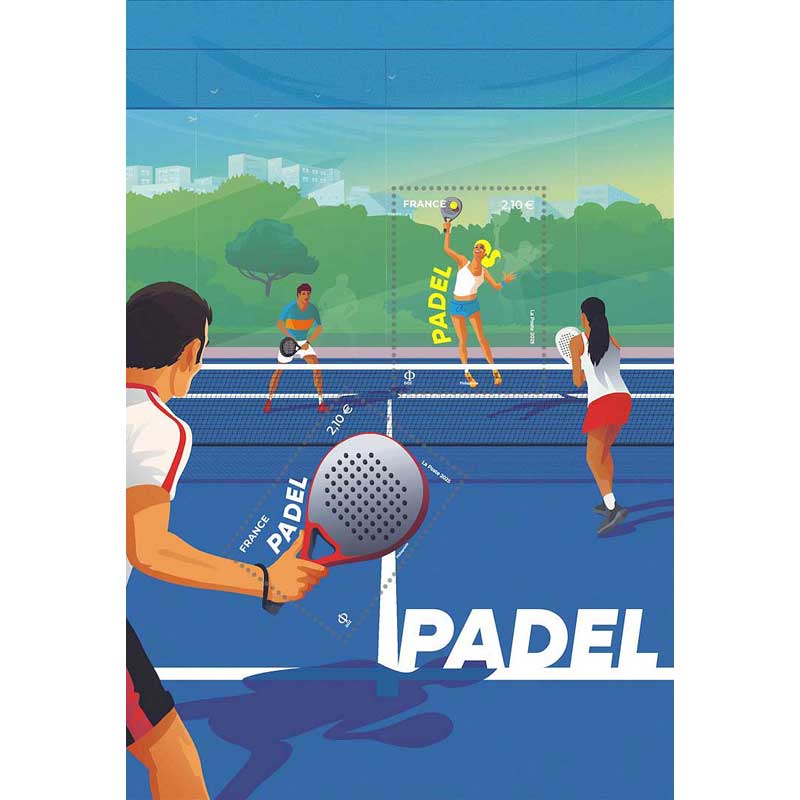 | Description | Emission d'un bloc dans la série Sport composé de deux timbres sur le padel. C’est un mélange de tennis et de squash, joué en double sur un terrain plus petit qu’un court de tennis et entouré de murs en verre et en grillage. En France le padel est en plein essor depuis le début des années 2000. |