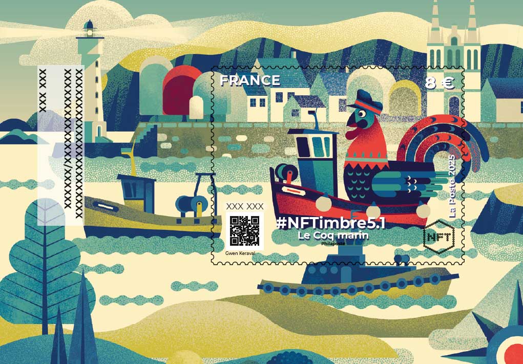 | Commentaire | le Coq marin, navigue le long du littoral. Un cinquième NFT au format numérique exclusivement est offert pour l’achat du pack. Les quatre blocs d’un timbre et les cinq NFT sont numérotés. La série #NFTimbre5 – Coqs français est composée de quatre blocs vendus à l’unité, également disponibles en pack. Chaque NFTimbre est constitué d’un bloc d’un timbre physique et de son jumeau numérique. |