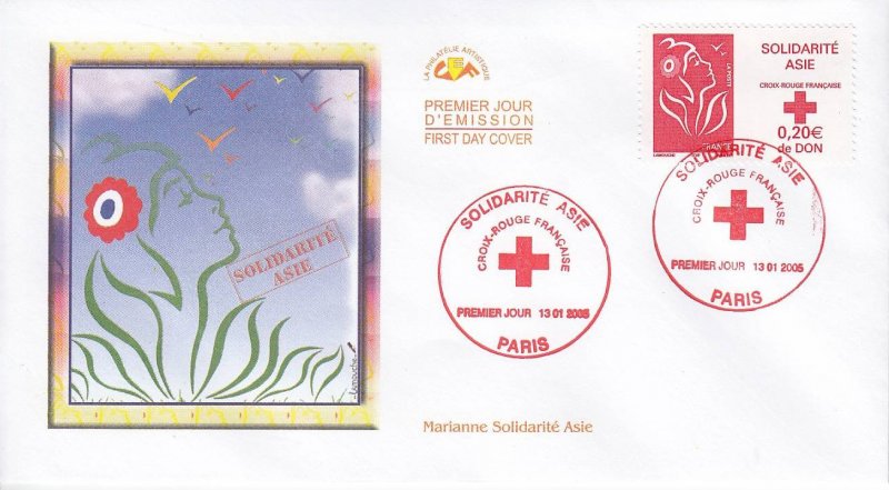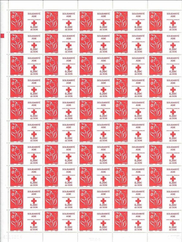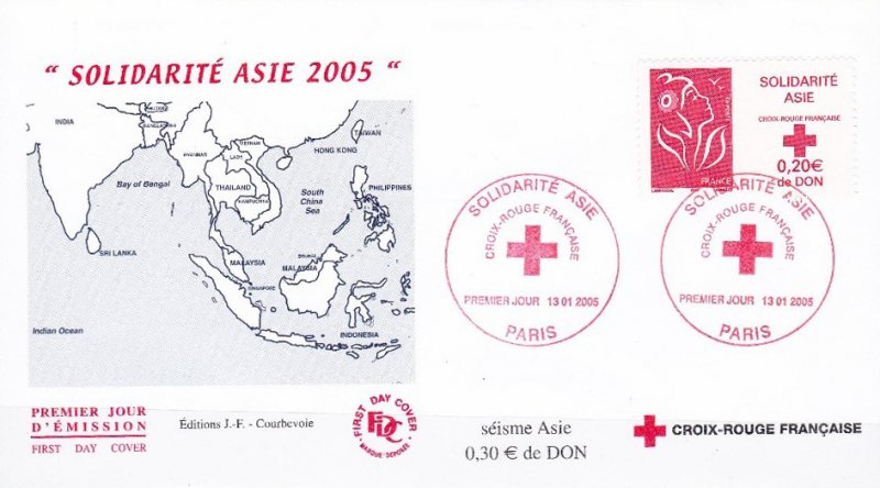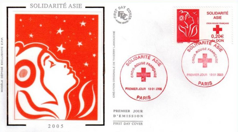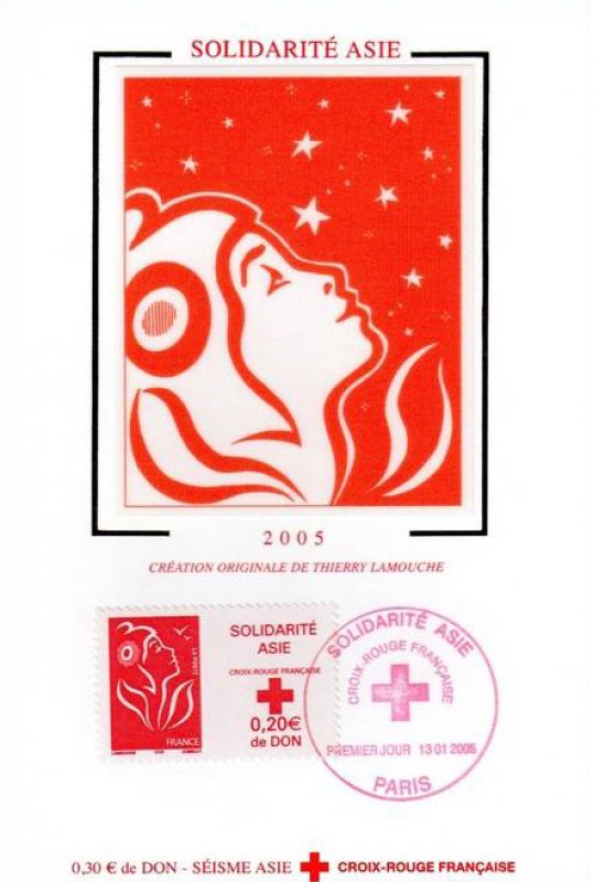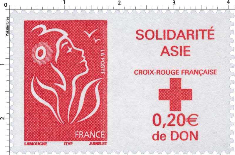 | Description | Solidarité Asie. Croix-Rouge française. Timbre avec surtaxe au profit des sinistrés du tsunami. Timbre sur timbre. Sans valeur indiquée (validité permanente) |
