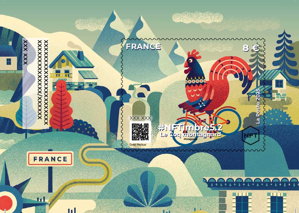 | Commentaire | le Coq montagnard, cycliste intrépide, serpente entre les sommets enneigés. Un cinquième NFT au format numérique exclusivement est offert pour l’achat du pack. Les quatre blocs d’un timbre et les cinq NFT sont numérotés. La série #NFTimbre5 – Coqs français est composée de quatre blocs vendus à l’unité, également disponibles en pack. Chaque NFTimbre est constitué d’un bloc d’un timbre physique et de son jumeau numérique. |