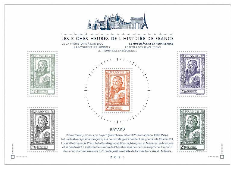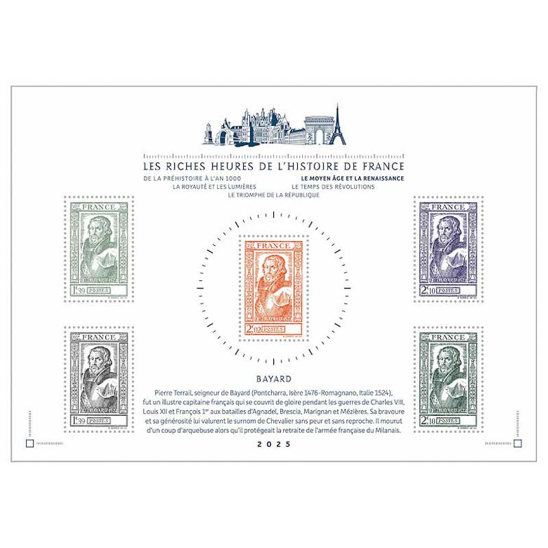 | Description | Provenant de l'émission de 11 feuillets qui vous propose de découvrir ou de redécouvrir, au travers de cette nouvelle édition répartie sur cinq ans, des timbres d’exception retraçant l’Histoire de France contée par la philatélie. |